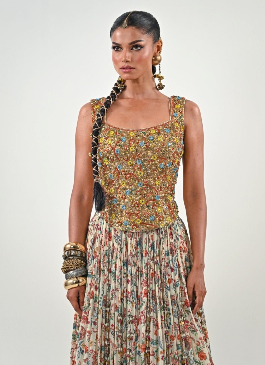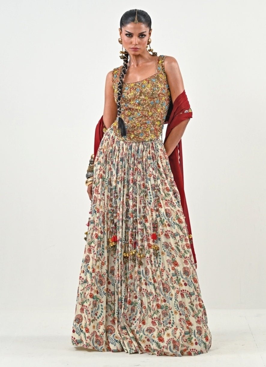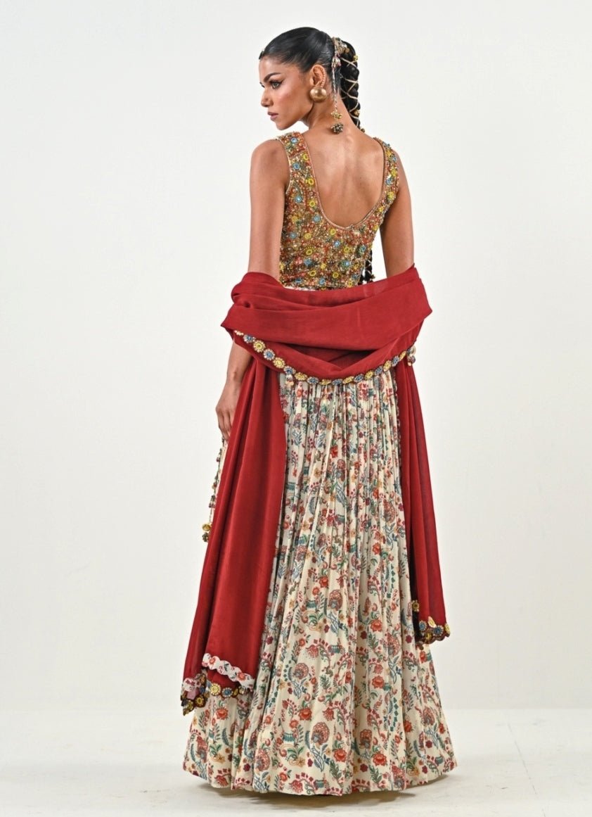 Dress the brief—refined, festive, unforgettable—in this Ivory and Gold Lehenga Set with a striking pop of red. The printed chinon lehenga flows effortlessly, creating a soft and elegant foundation. An embroidered tassel blouse adds artisanal charm, while the contrasting red dupatta brings bold colour and celebratory energy to the look.