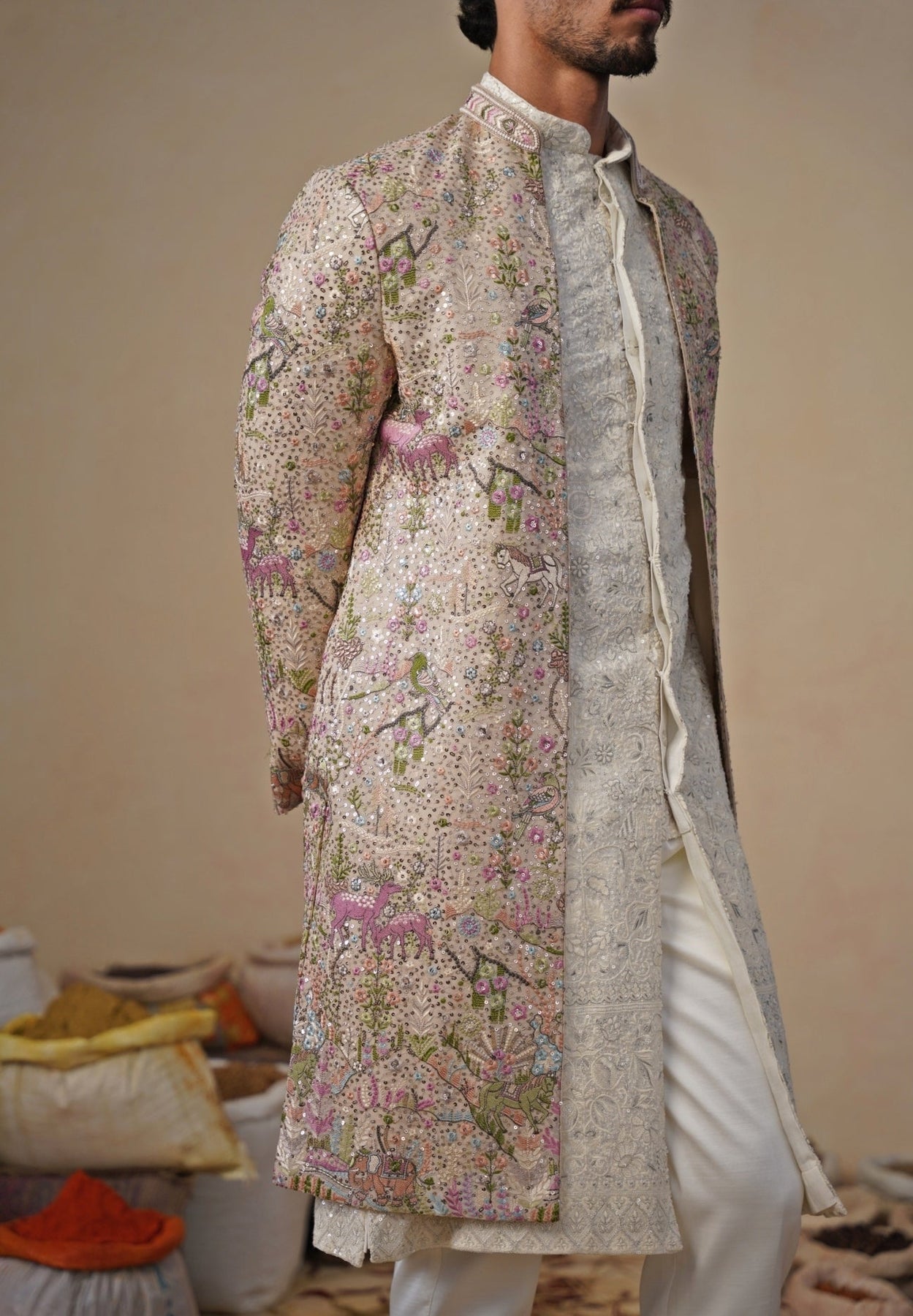 Celebrate your big day with luminous restraint in this Beige Gold Sherwani Set. Straight pants give a polished base, paired with a front-open inner layer that keeps the look modern and wearable. The outer sherwani-style jacket is detailed with intricate embroidery inspired by nature, creating a rich, artisanal surface that glows under warm lights. The elongated cut adds ceremony-worthy presence while staying effortlessly refined.