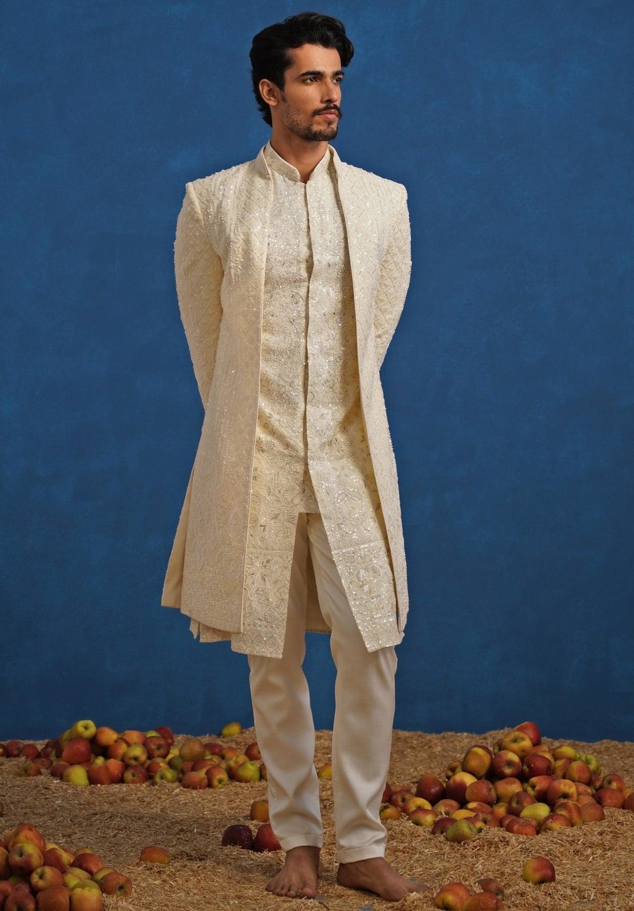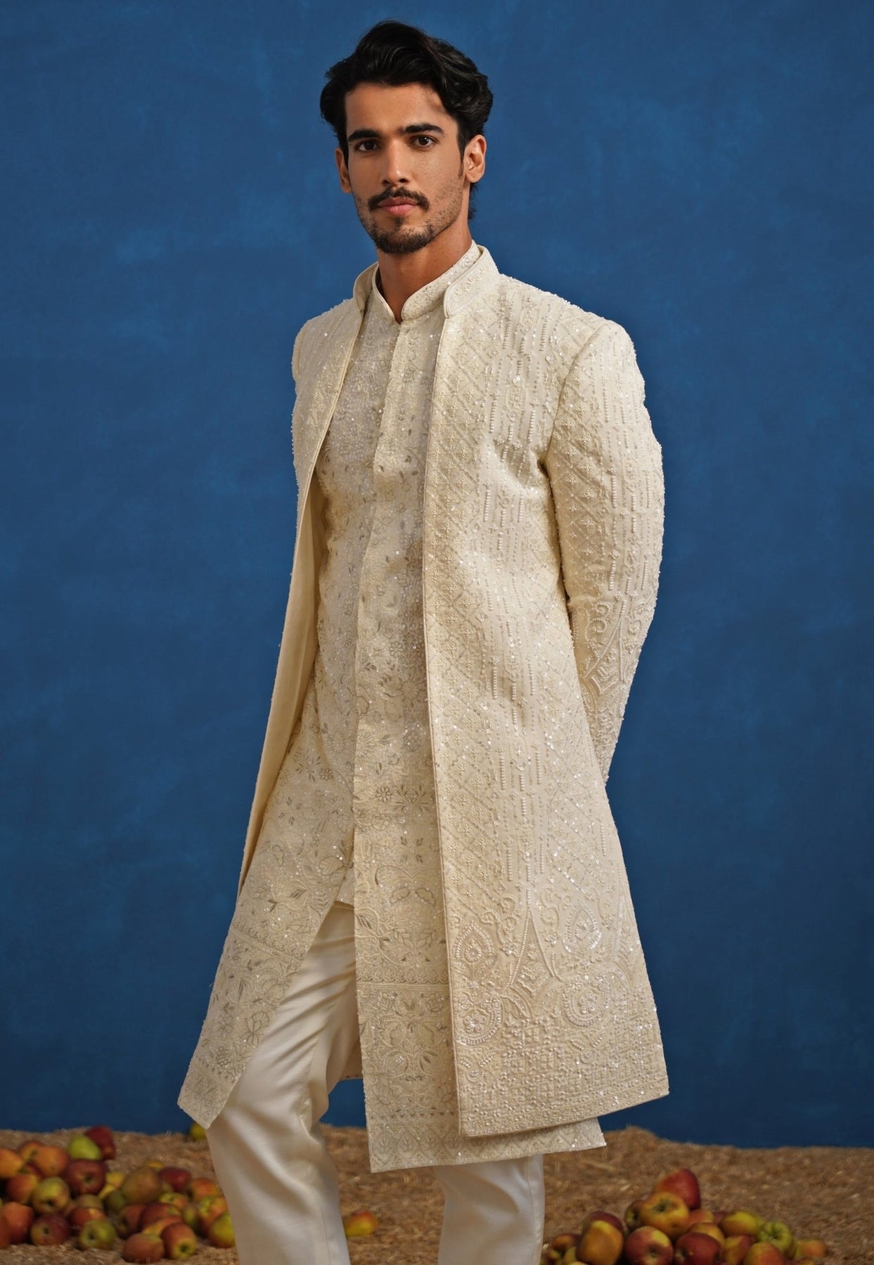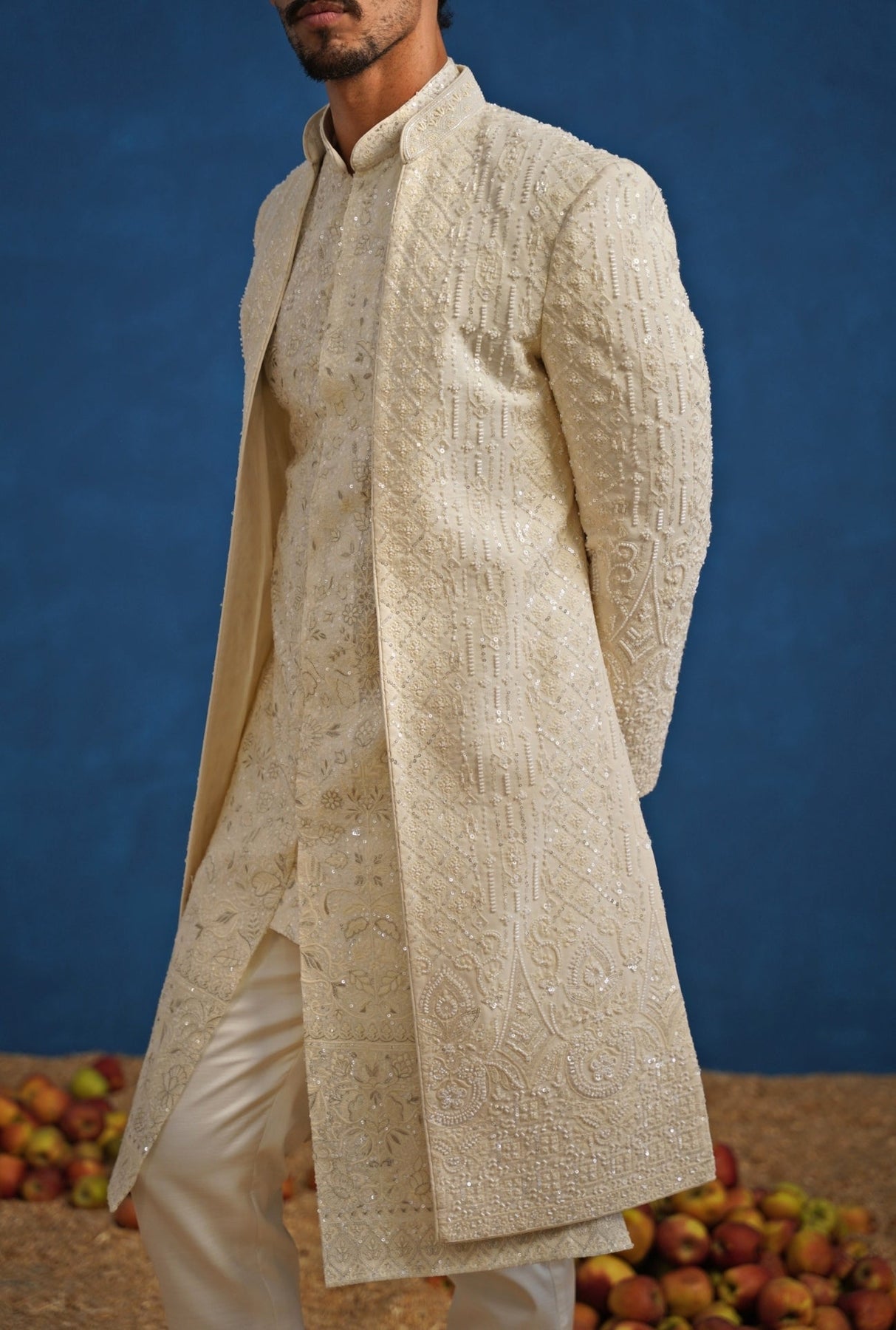 Understated luxury defines the Ivory Sherwani Set. Straight pants provide a sleek, contemporary foundation, complemented by an inner kurta with subtle detailing that never competes. The sherwani’s cutdana embroidery blooms in ornate floral motifs, adding dimensional texture and a delicate shimmer, finished with a clean neckline and elongated cut for a ceremonial look that feels modern and composed.