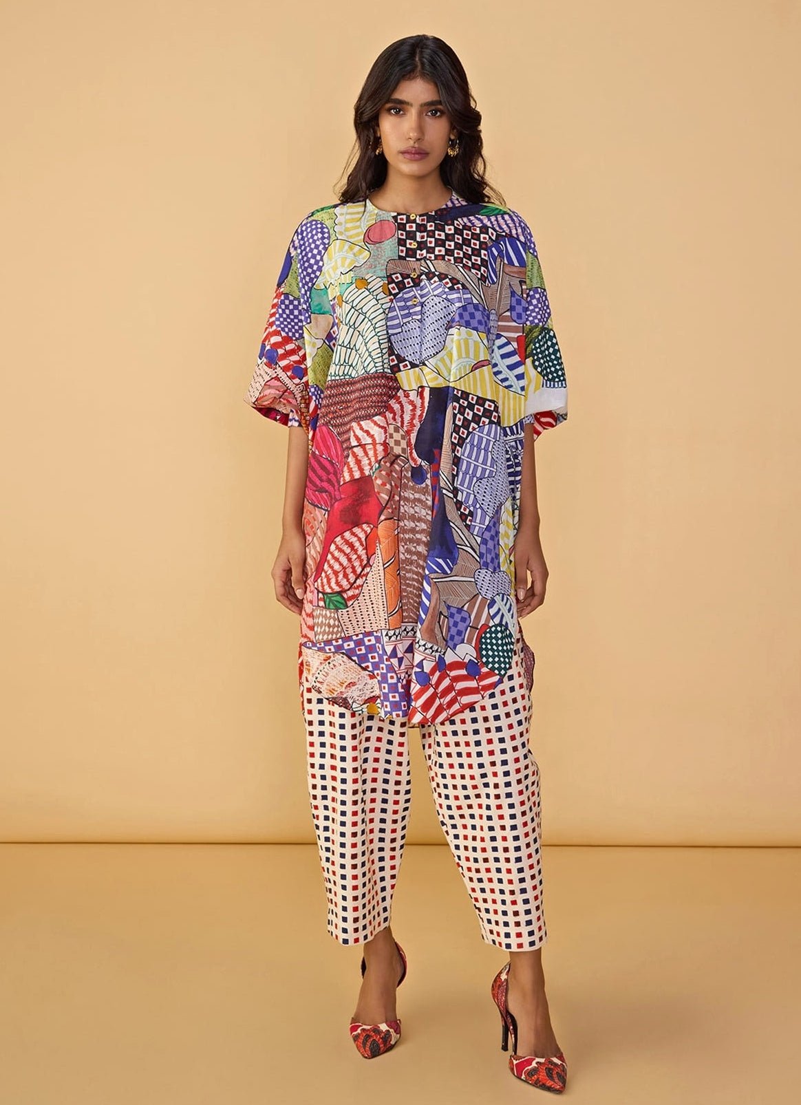 Express effortless style with this Multicolour Printed Tunic designed for relaxed elegance. Featuring an abstract bird print, the tunic showcases an asymmetric hemline and a relaxed fit that creates graceful movement and modern appeal. The collared neckline adds subtle structure while maintaining the easygoing charm of the silhouette. Designed with thoughtful detailing and contemporary artistry, this versatile piece blends comfort with bold design.