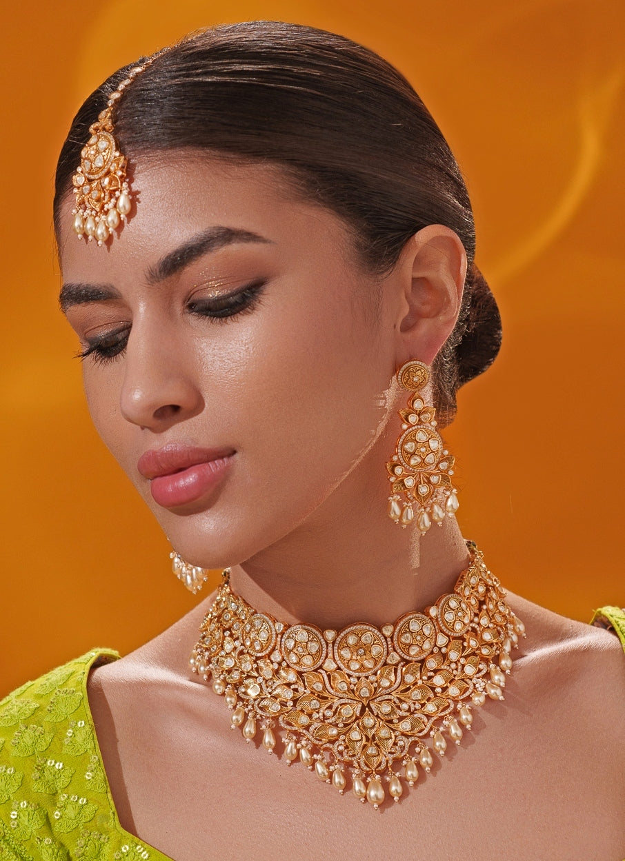Moissanite Stone Gold Necklace Set with Maangtikka