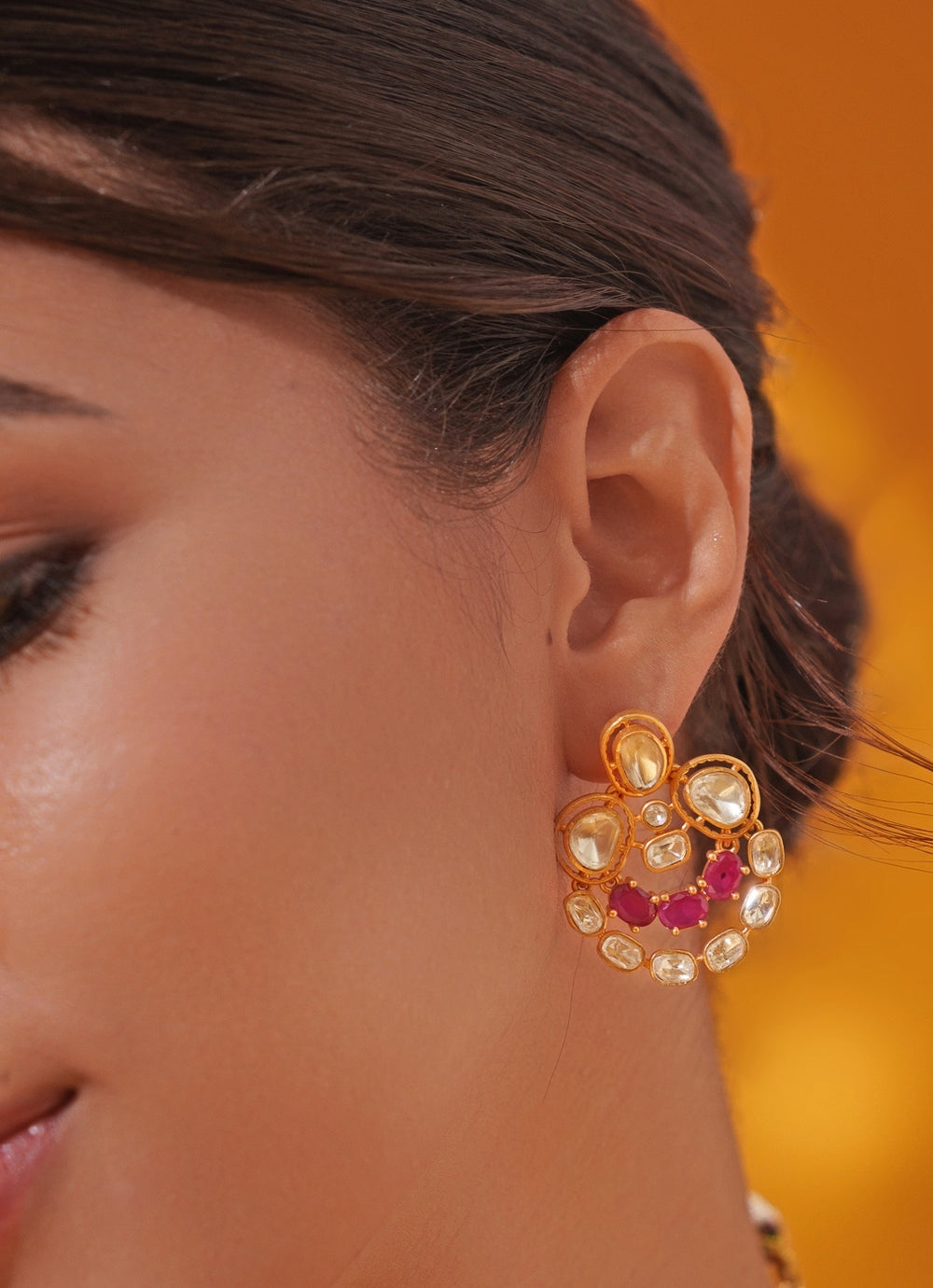 Red Moissanite Stone 3 Line Gold Long Necklace Set