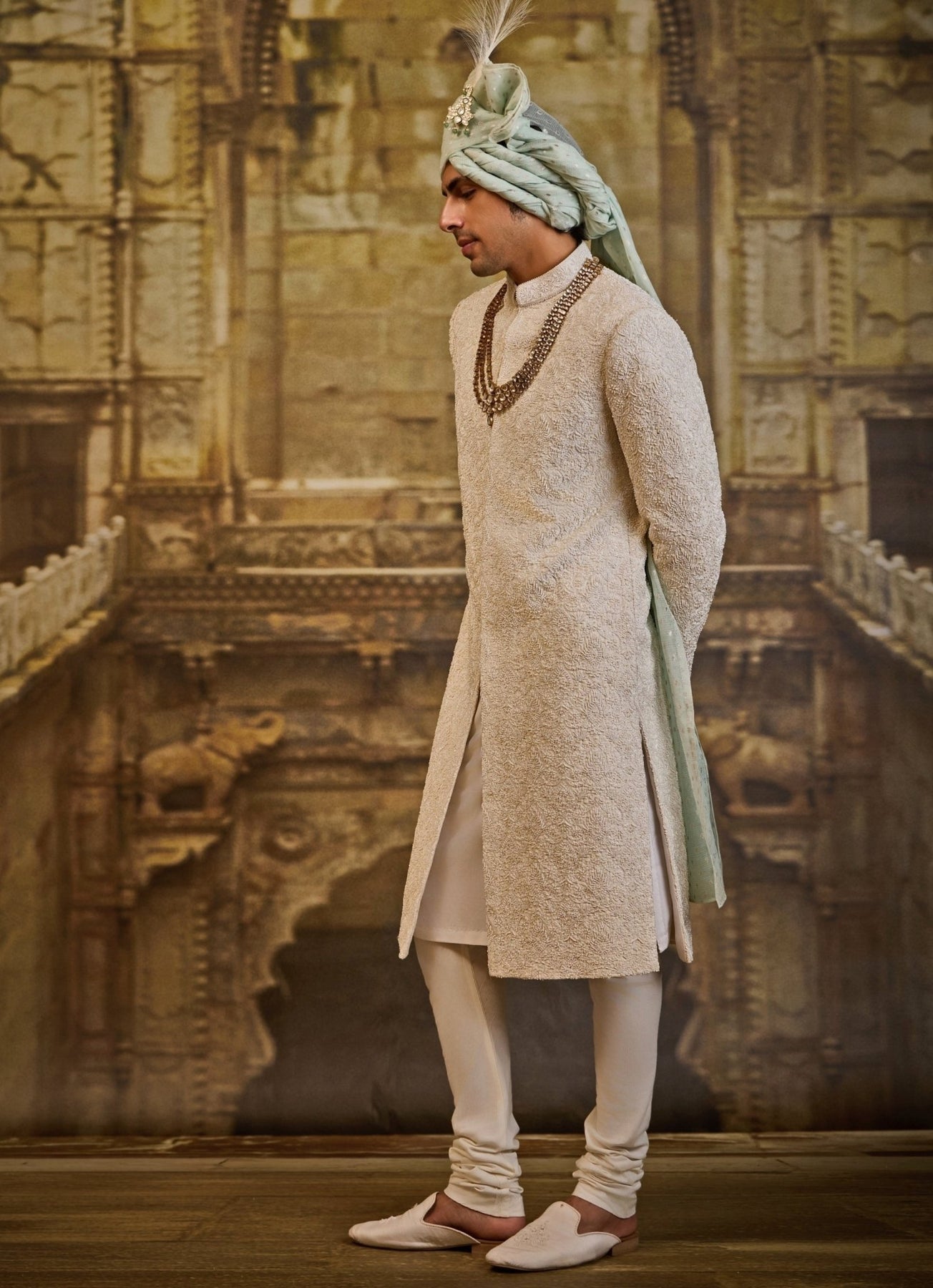 Create a grand yet composed look in the Ivory Sherwani Set adorned with intricate resham, cutdana, and beadwork throughout. Styled with a cotton silk kurta and churidar, it balances classic craftsmanship with contemporary polish. Optional worked jutis complete the ceremonial look effortlessly.