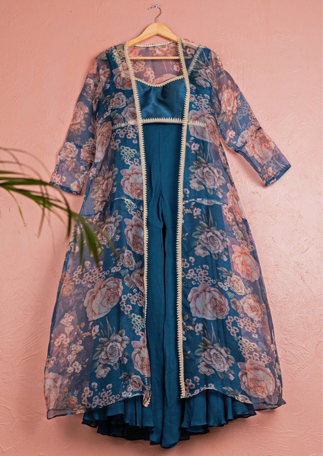 Radiate joy and sophistication at weddings with the Midnight Blue Sharara Set with Floral Jacket. The flared georgette sharara moves fluidly, offering effortless elegance for every celebration. It is paired with a raw silk blouse richly embroidered with delicate zari and sequins work, adding subtle shimmer. A sheer organza floral jacket layered on top enhances the look with refined charm and a touch of glamour.