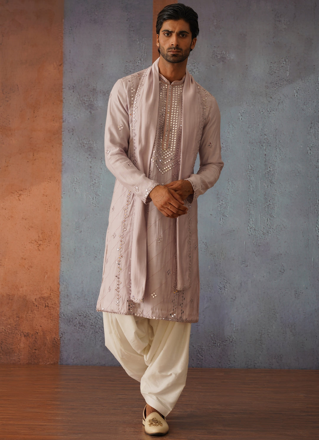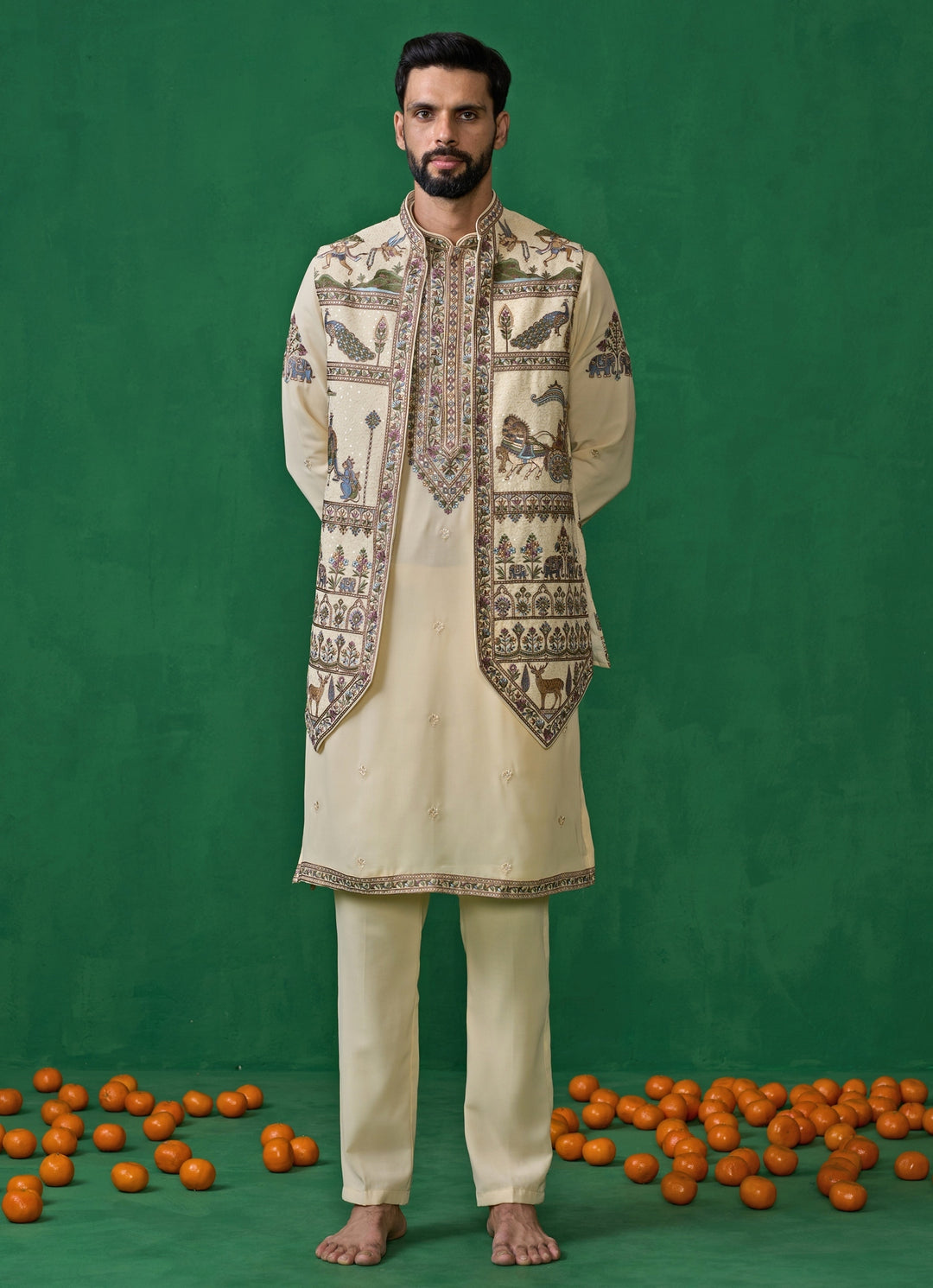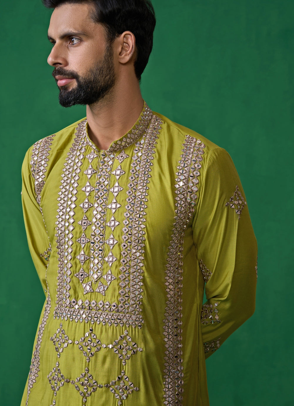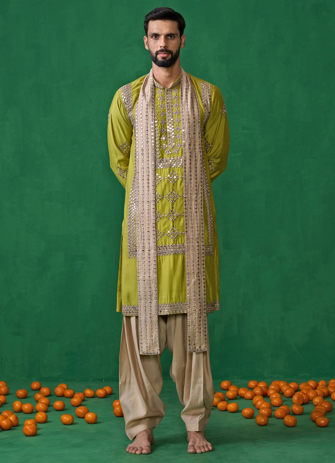 Green and Beige Mirror Embroidered Silk Kurta Set