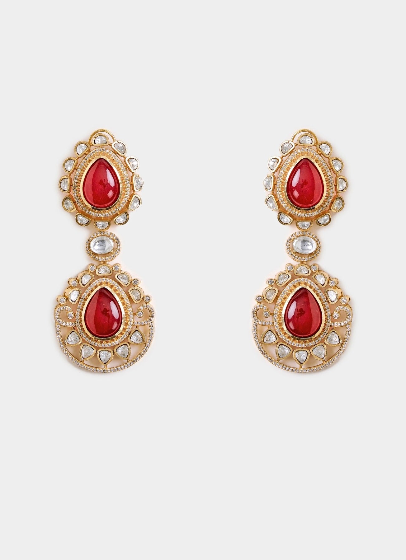 These ruby red statement drop earrings feature bold red stones framed in intricate gold detailing, creating a royal and glamorous finish. Perfect for weddings, festive celebrations, and elevated party looks.