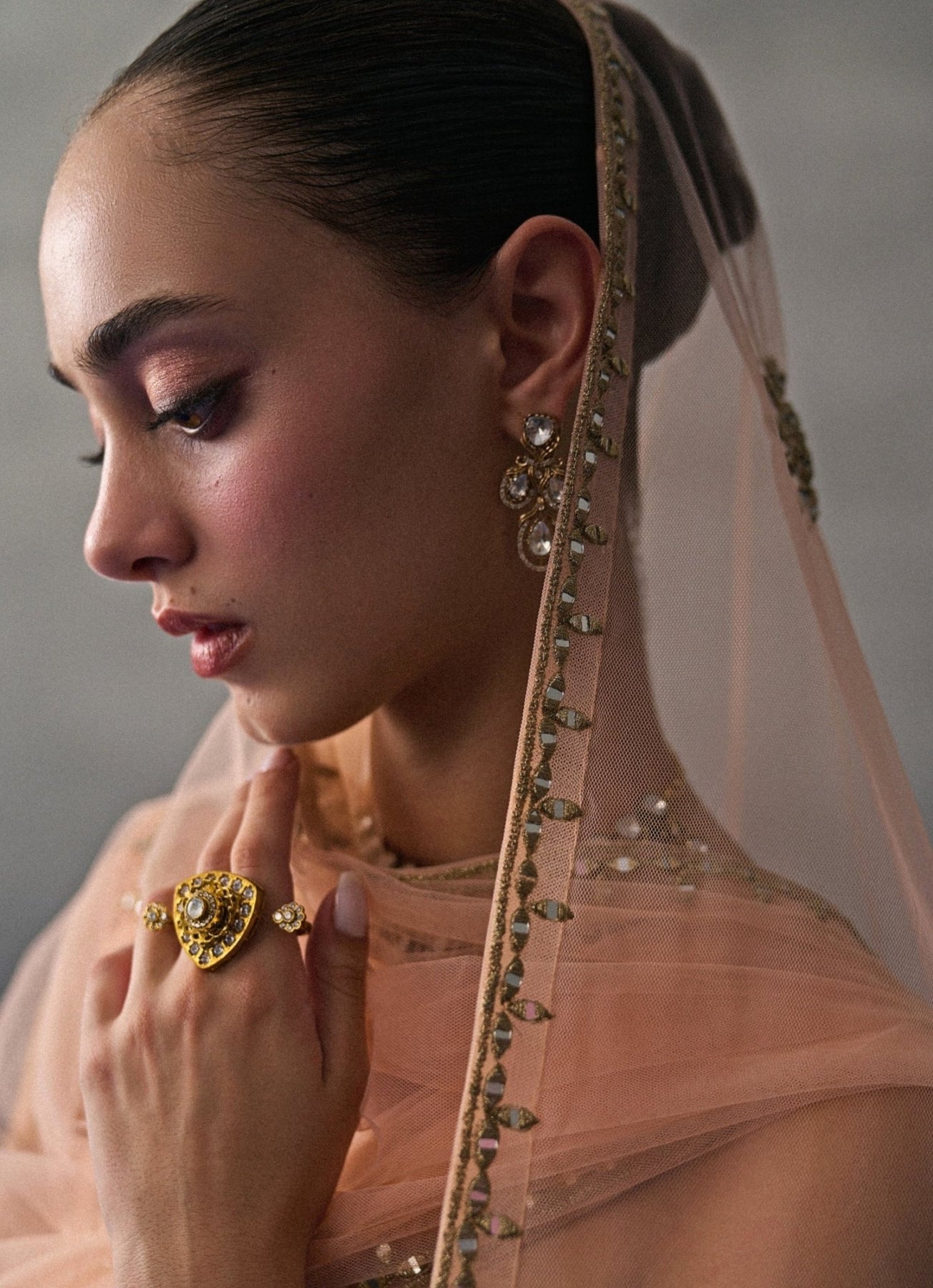 Be the embodiment of classic elegance at family events in the Peach Lehenga Set with a warm, refined glow. The banarasi silk lehenga feels opulent with its rich weave and gentle sheen. A coordinated blouse is accented with mirrorwork for festive brightness, and the dupatta completes the look with an elevated, heritage finish. Add a pearl choker and glossy waves for a polished statement look.
