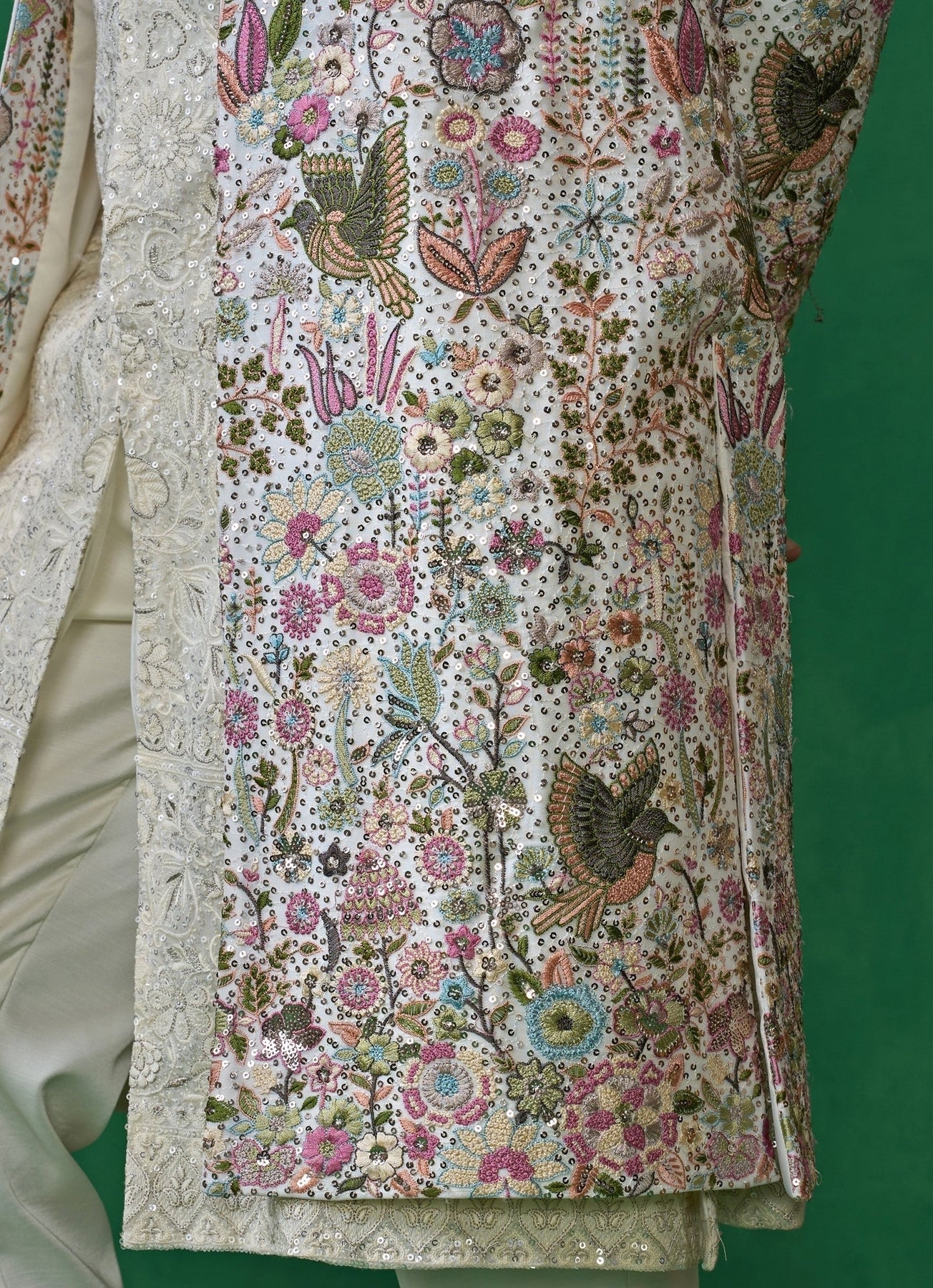 Step into timeless grandeur with the Ivory Embroidered Jacket Kurta Set, an Indo-Western masterpiece that fuses royal tradition with modern refinement. The long sherwani is adorned with intricate floral and nature-inspired embroidery, layered over an embroidered kurta and straight trousers for a sleek yet majestic look.