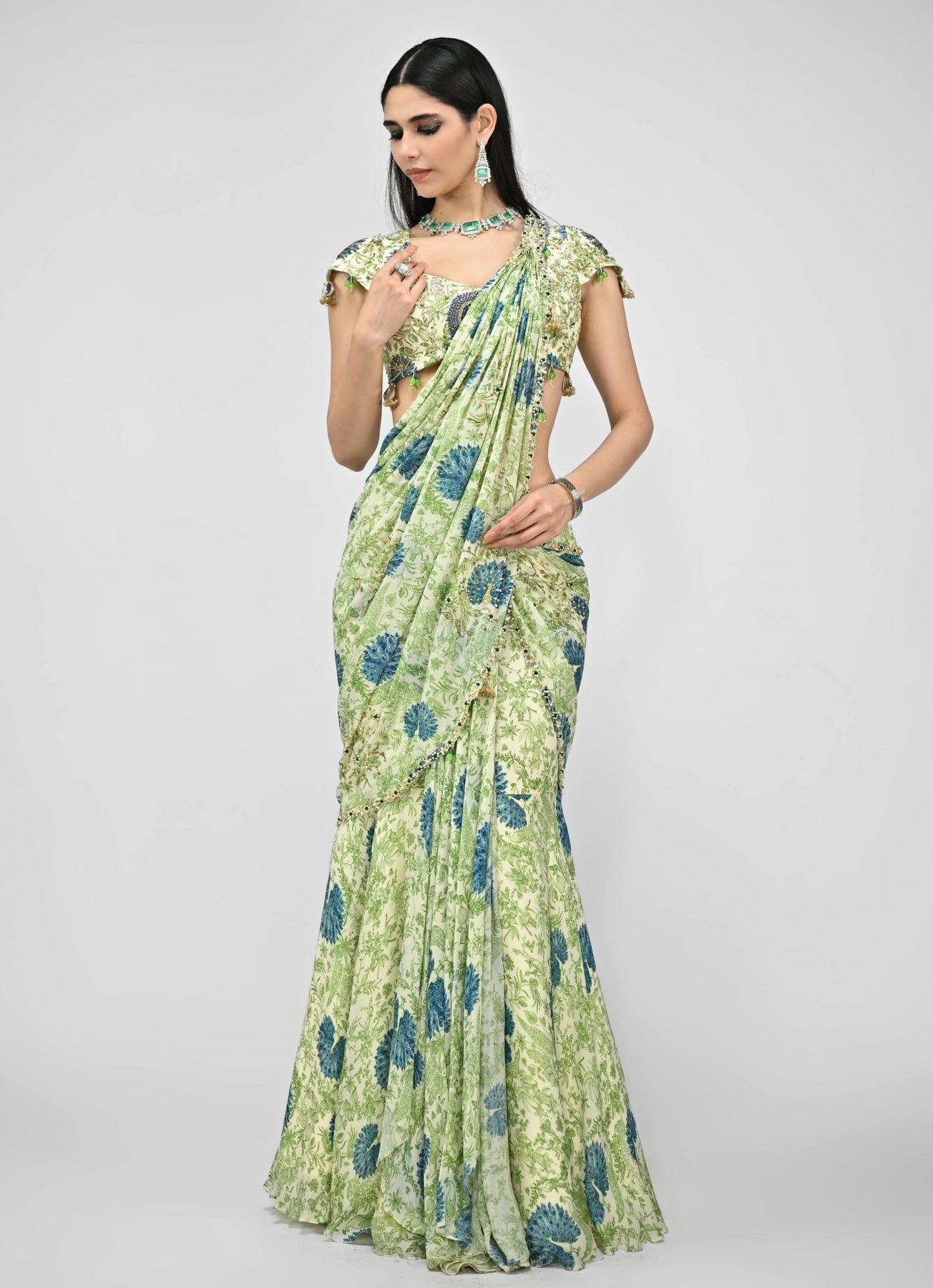 Green Printed Chinon Pre - Draped Saree Set Juhi Bengani - Fabilicious Fashion