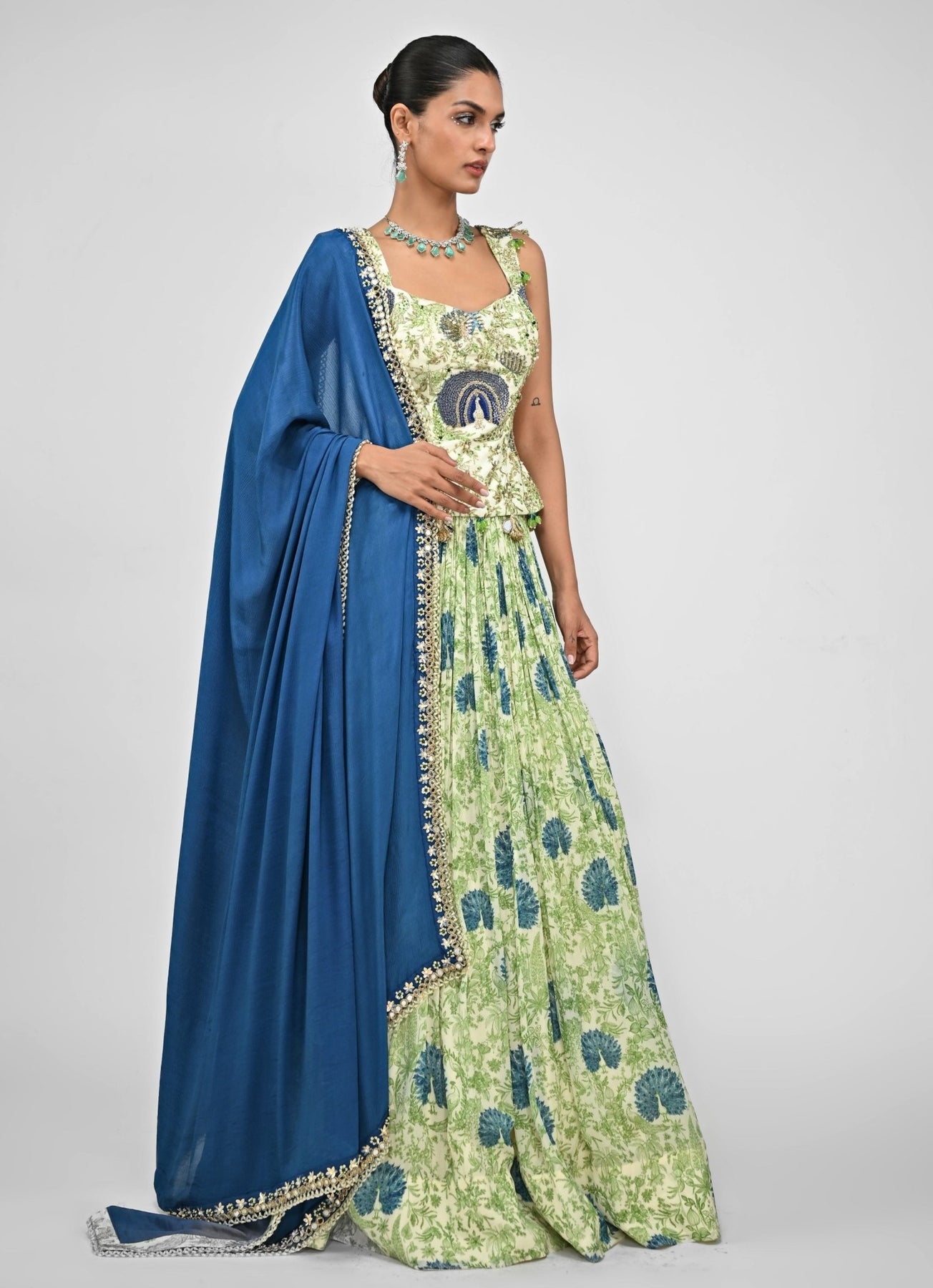 Mark the moment with refined dressing in this green printed corset lehenga set. The flowing lehenga features delicate prints that shimmer softly under light, while the corset blouse enhances the silhouette with structured grace. Paired with a light dupatta, this lehenga set exudes understated glamour and modern elegance.
