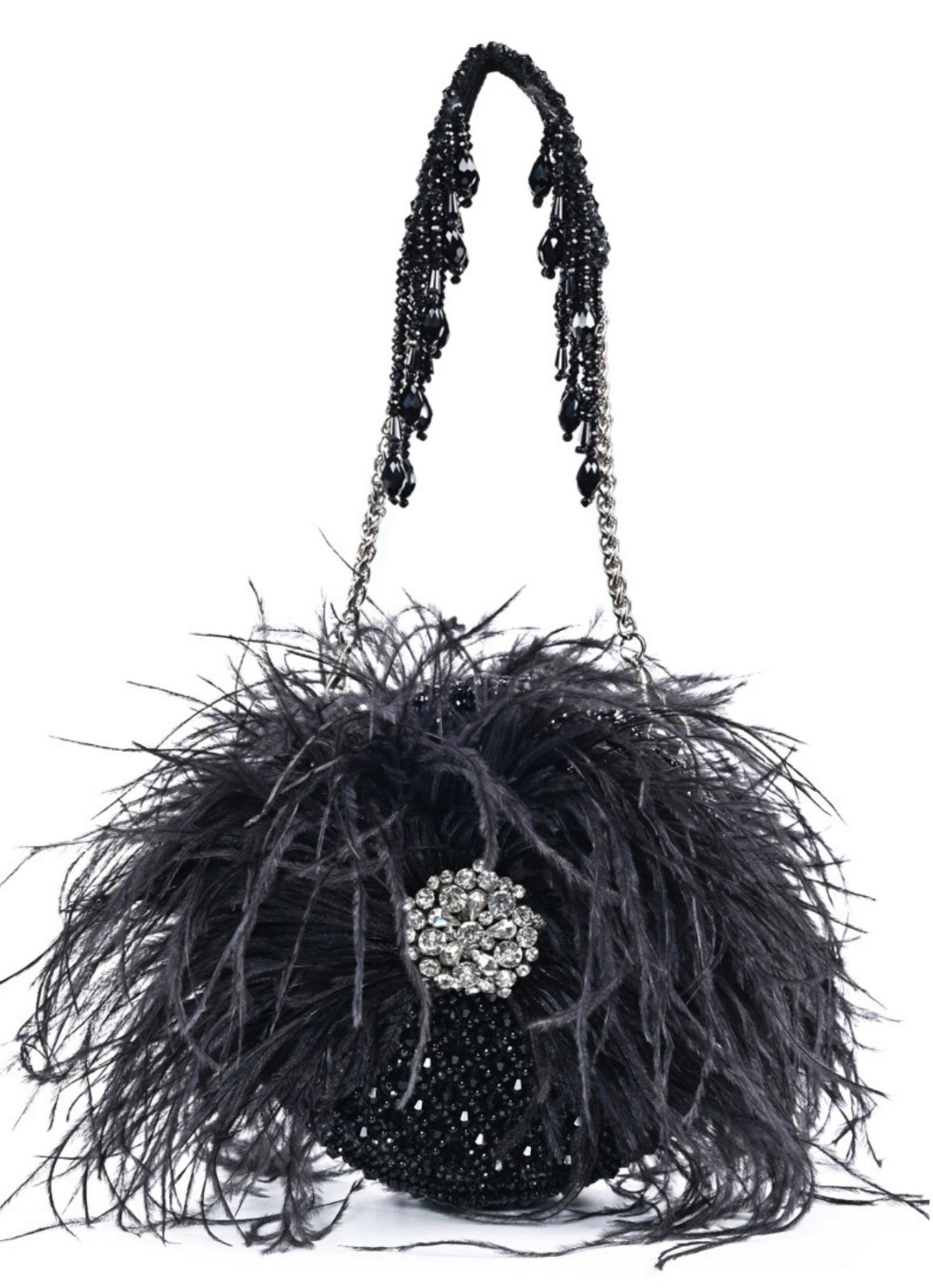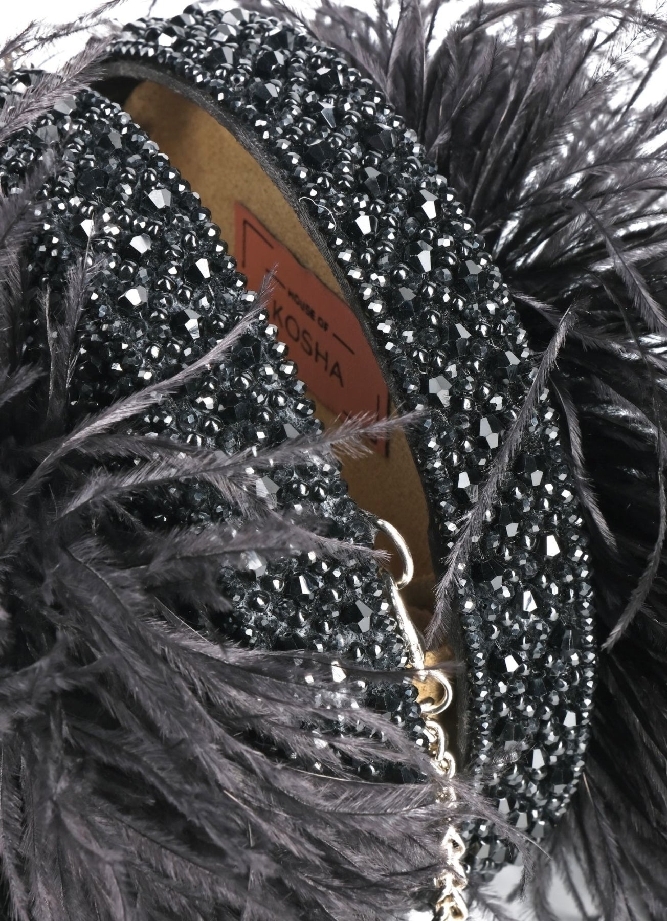Adorned with feathers and a beautiful brooch on both sides, representing a playful blend of modern and contemporary aesthetics. Exclusively hand-crafted with black feathers and a crystal base for added drama. It comes with a detachable chain hand-embroidered with crystals and a magnetic flap closure.