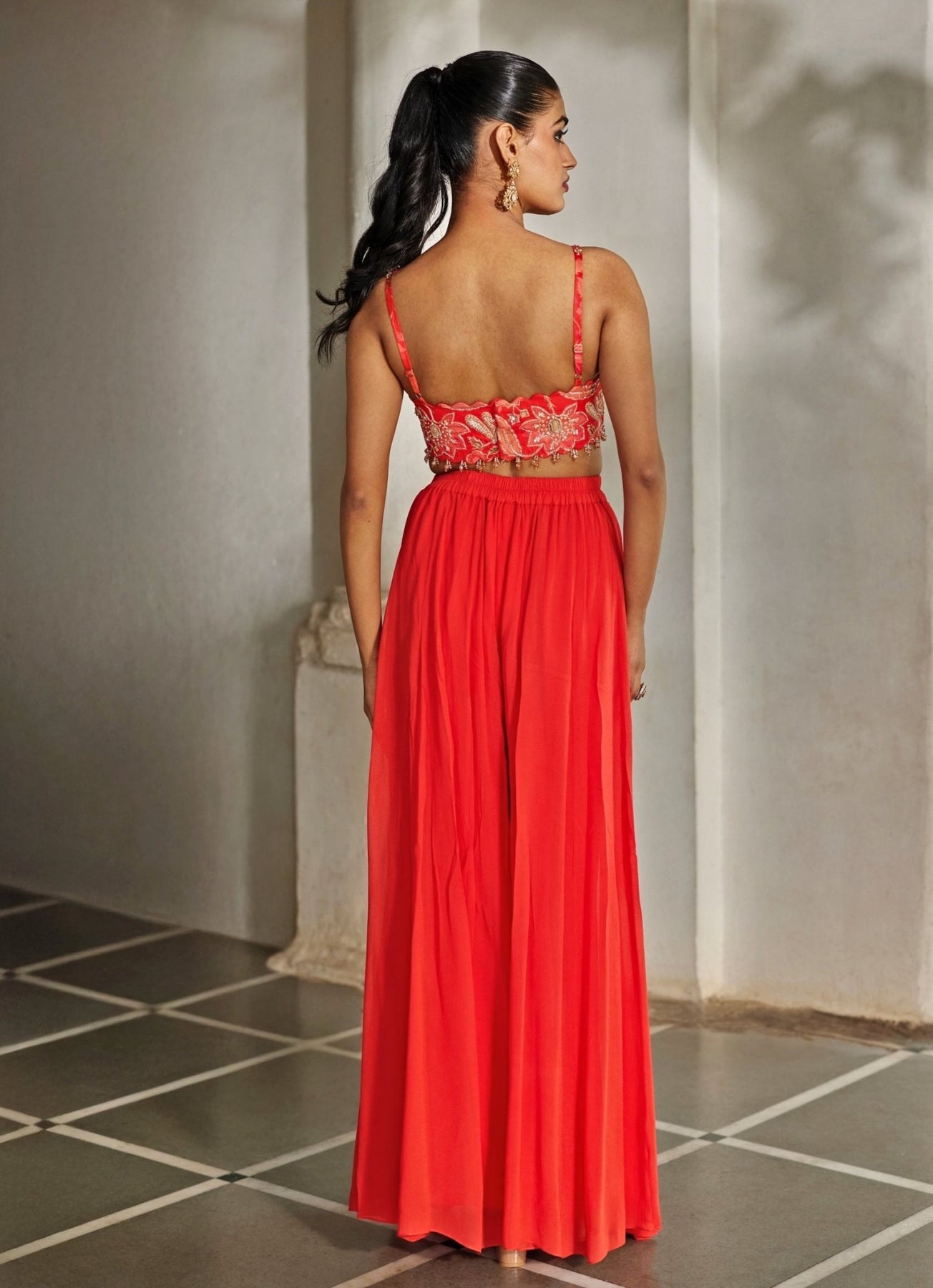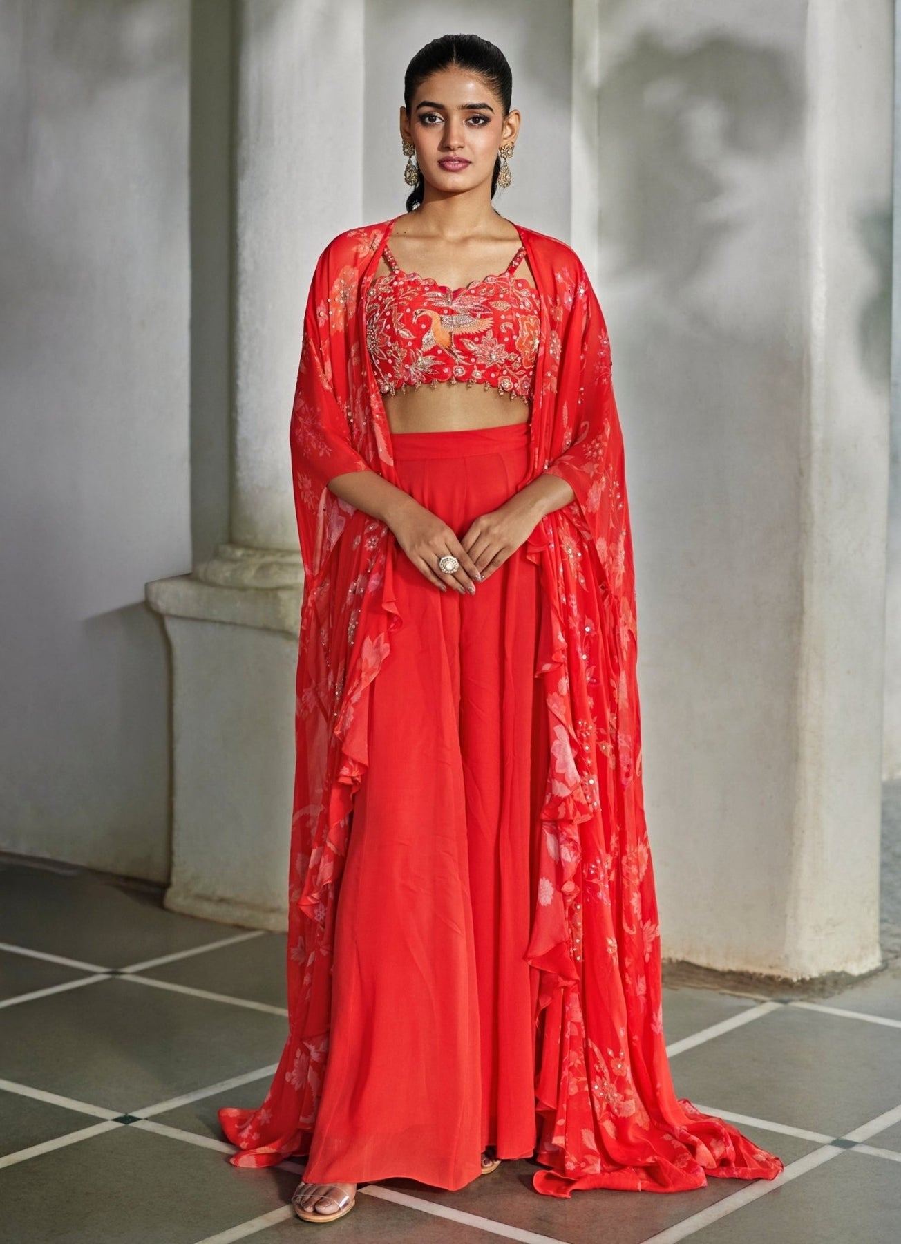 Bring resort-ready glamour to your wedding guest wardrobe with this Red Palazzo Jacket Set. The dramatic printed jacket features sequin highlights for a soft shimmer, layered over a hand-embroidered crop top with hanging accents along the waistline in the same print. Flowing georgette palazzos keep the look light, effortless, and easy to move in from brunch to after-party. Style with metallic heels and a sleek clutch.