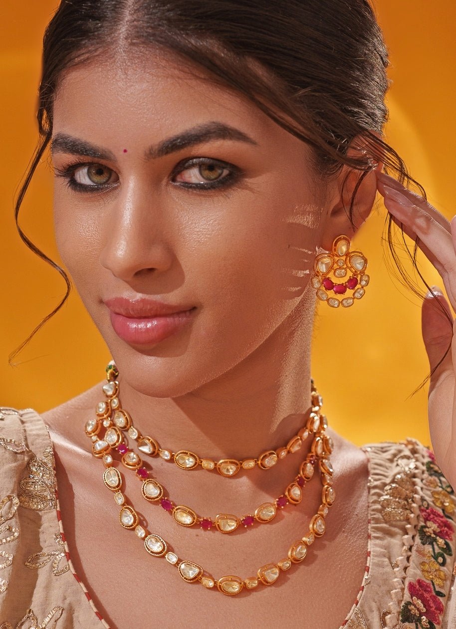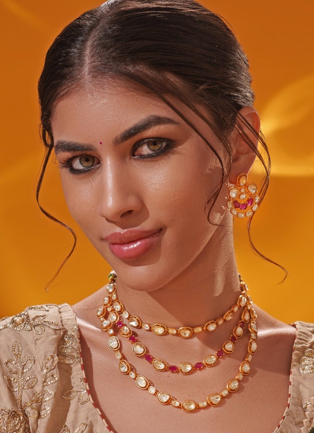 A majestic three‑line long necklace set lit by moissanite brilliance and a vivid hint of red. Complete with matching earrings, its elongated silhouette adds ceremony and grandeur for a saree.