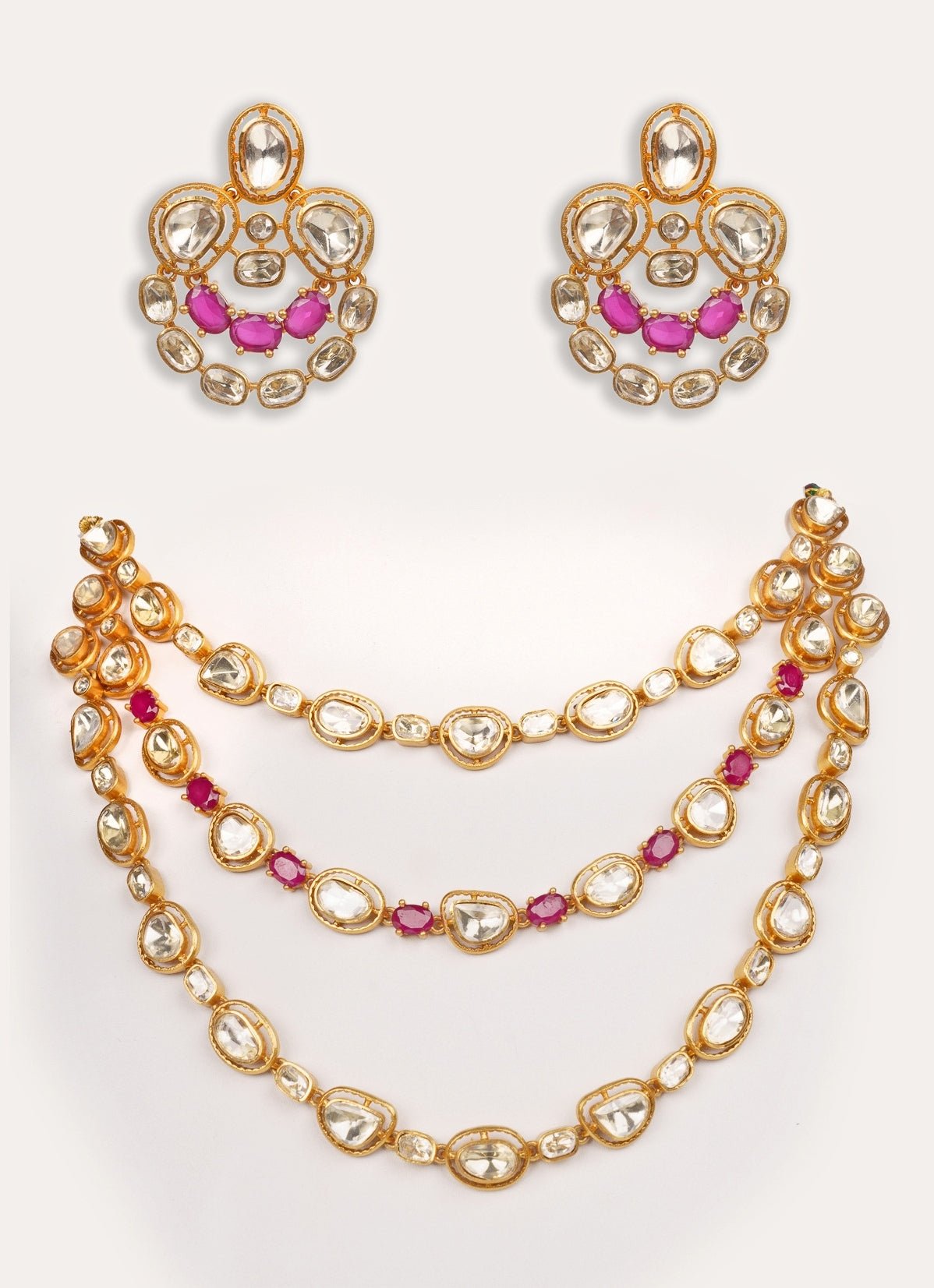 Red Moissanite Stone 3 Line Gold Long Necklace Set