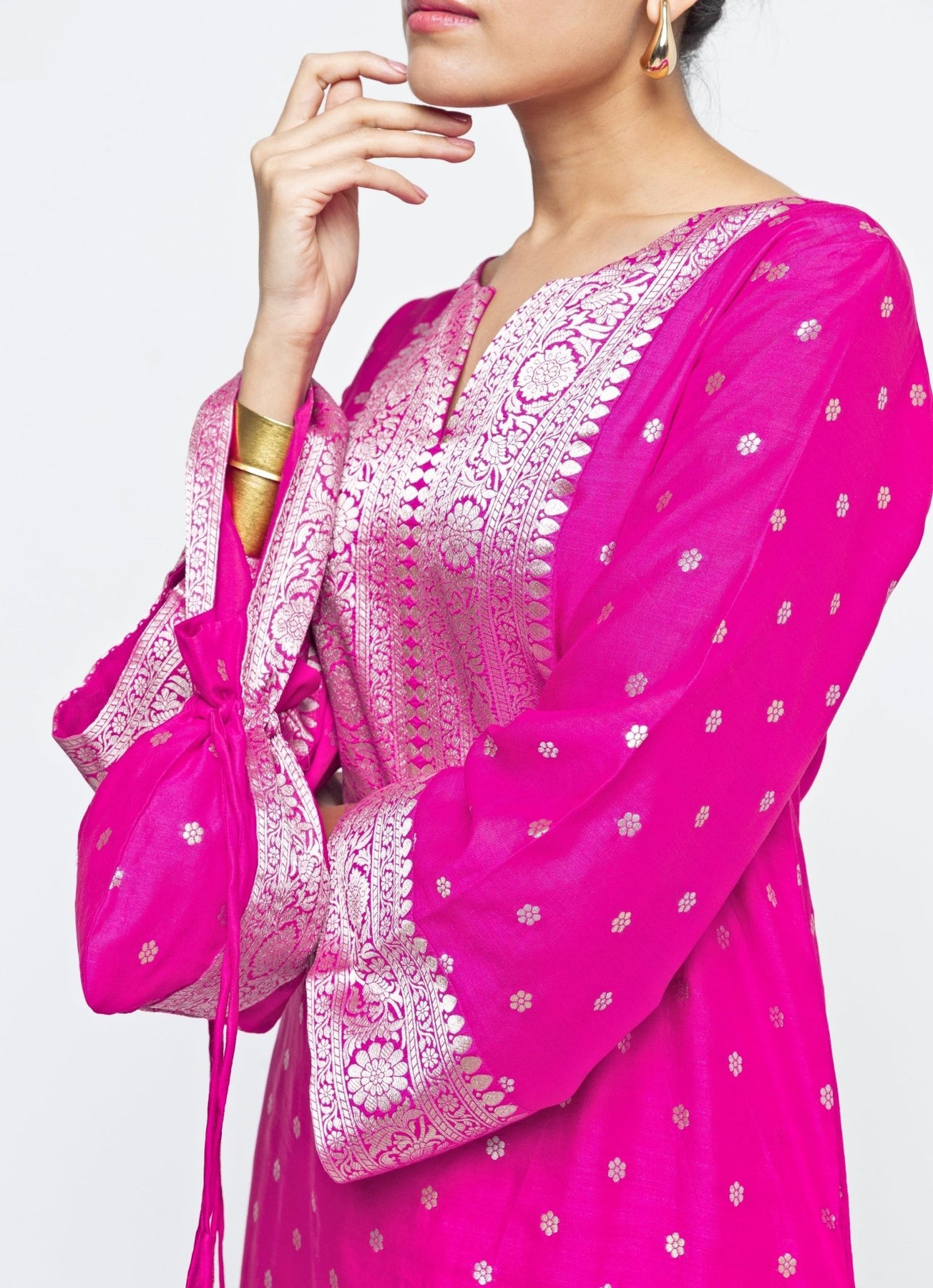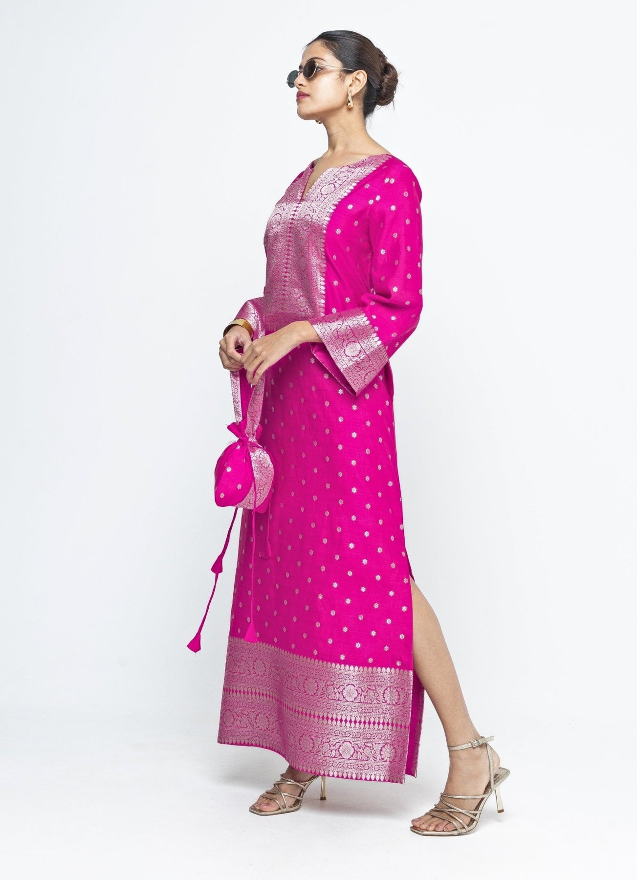 Bring playful glamour to every event in this Pink Slit Kaftan, crafted for effortless elegance. The butti silk flows beautifully, while brocade detailing along the yoke, sleeves, and hem adds richness and shine. Side slits introduce ease and movement, making it perfect for breezy celebrations and scenic destinations. Blending tradition with modern refinement, this look delivers comfort, colour, and quiet luxury in every step.