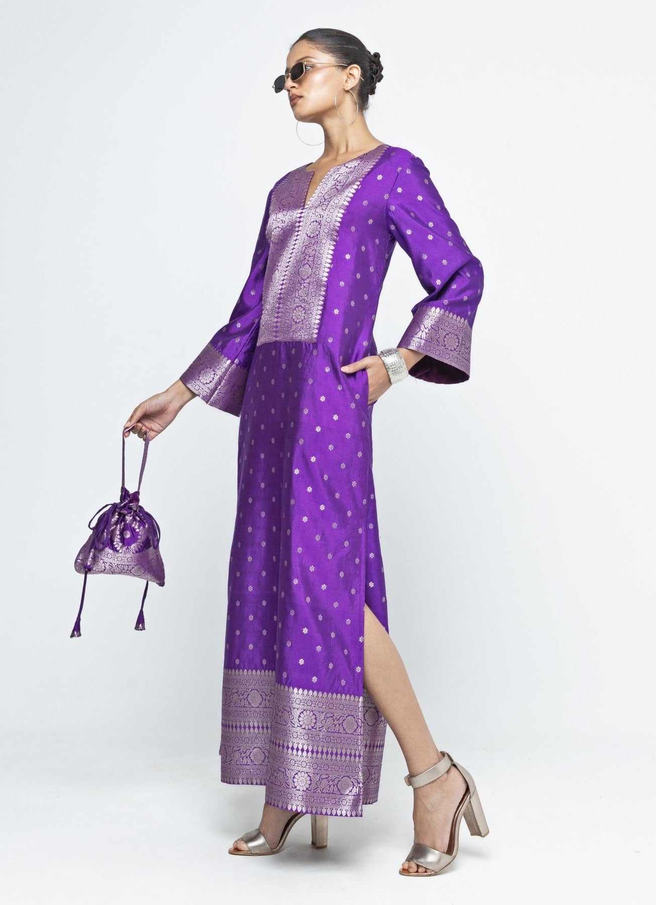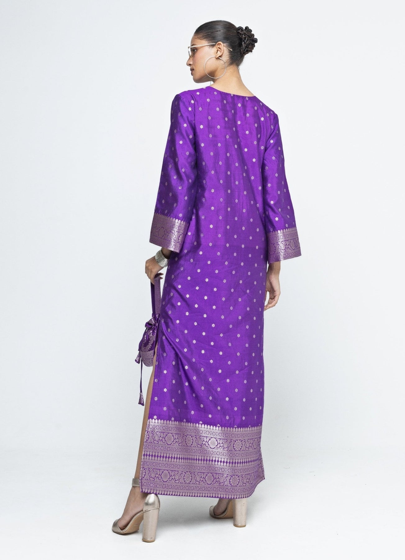 Shine as the ultimate wedding guest in this Purple Slit Kaftan, crafted for those who love effortless glamour with traditional accents. The butti silk base glows softly, while brocade detailing across the yoke, sleeves, and hem lends luxurious texture. Side slits introduce movement and ease, making it an elegant choice for daytime celebrations. Graceful, breezy, and beautifully detailed, it merges comfort with elevated style.