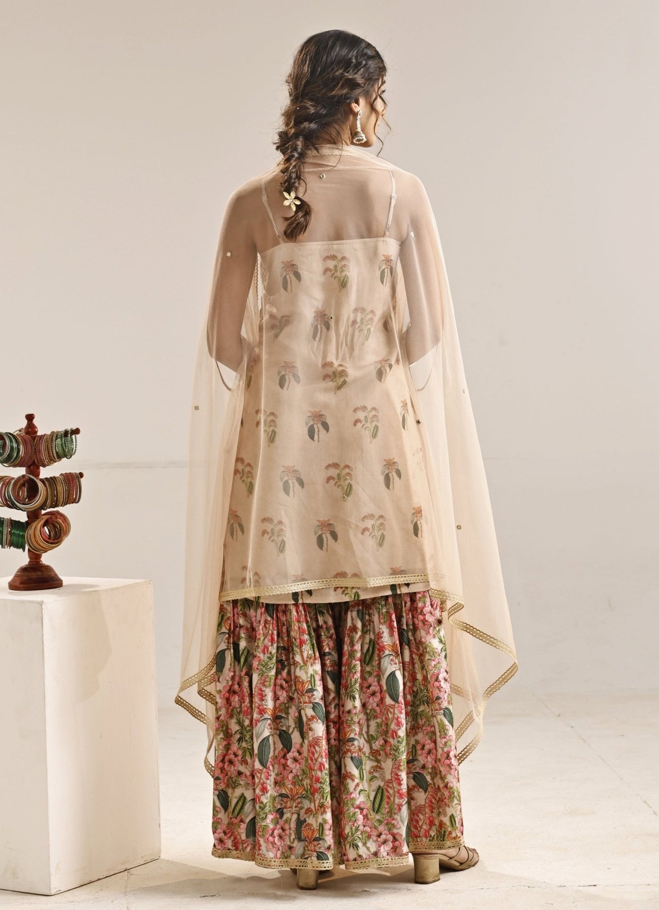 Celebrate in elegance with the Beige Kurta Sharara Set with Cape. The printed sharara pants offer effortless fluidity, creating graceful movement with every step. They pair beautifully with the sleeveless silk kurta, embellished with fine details that adds refined shimmer and contemporary charm. The embroidered soft net cape drapes lightly over the look, lending dimension and a touch of festive grandeur.