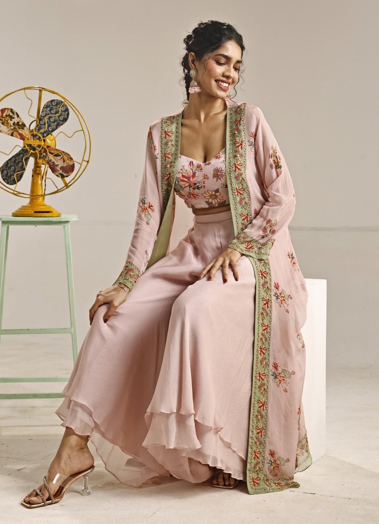 Step into festive glam wearing the Pastel Pink Pants Set with Cape. The plain palazzo pants in soft crepe offer graceful movement, creating an elegant canvas for daytime celebrations. Paired with a printed bustier, the look feels modern and effortlessly chic. The embroidered organza cape adds a refined layer of texture and shine, bringing depth and airy sophistication to the look.