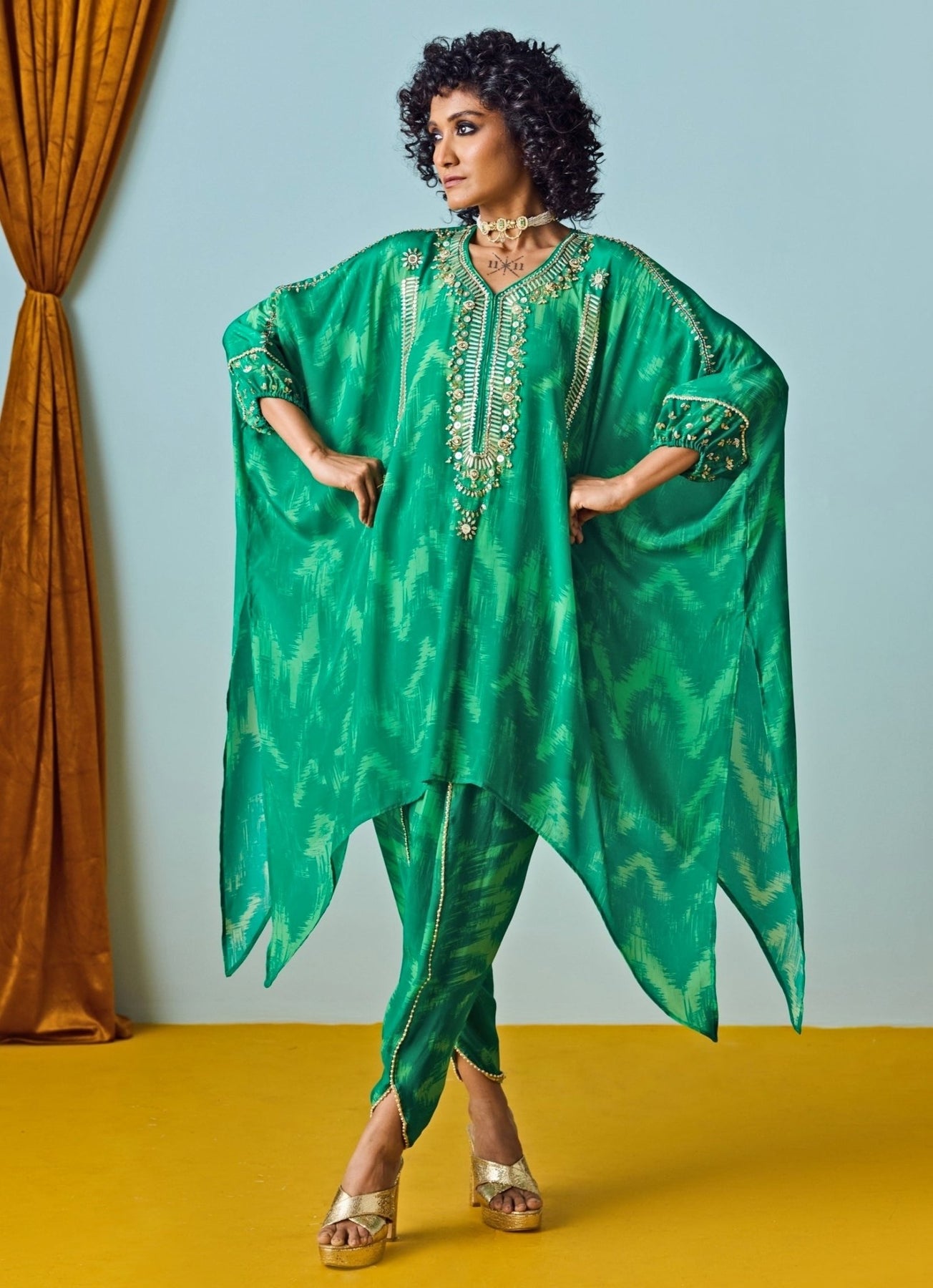 Green Printed Crepe Silk Kaftan With Tulip Pants Prahnaaya - Fabilicious Fashion