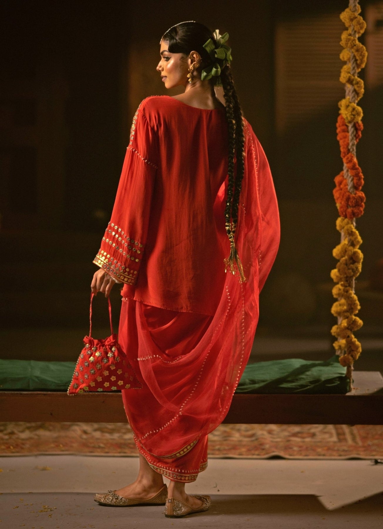 Composition : Tunic Jacket, Skirt and Dupatta- Vegan Crepe Silk and Organza Silk