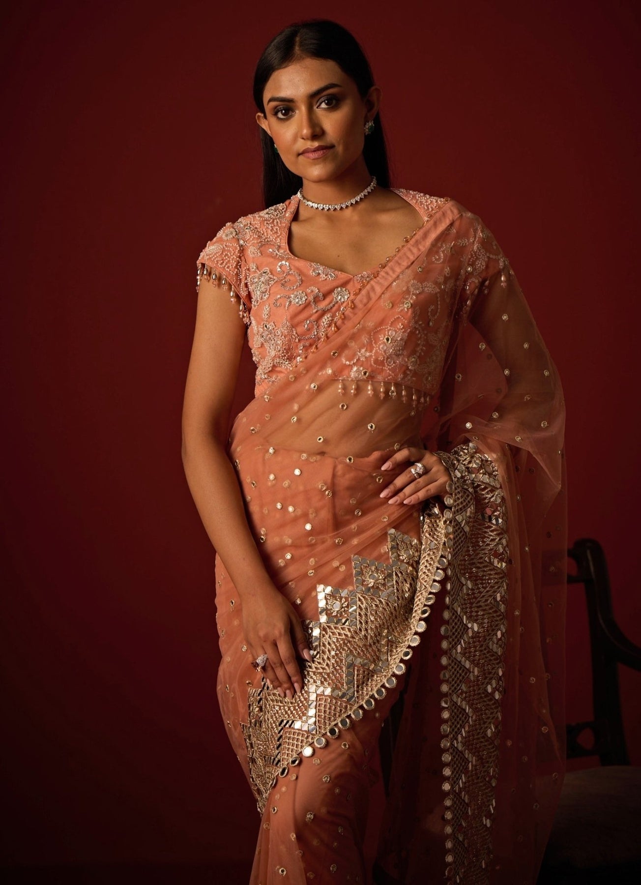 Celebrate your loved one’s big day in the Pastel Pink Saree, crafted with dreamy finesse. The soft net saree features an intricate mirrorwork spread and delicately embellished borders that shimmer beautifully under soft light. Paired with a deep-neck blouse edged in crystal laces and detailed with beads, sequins and mirrors, the look glows with modern refinement. Beaded tassels on the pallu add graceful movement, tied together with a satin box-pleat underskirt.