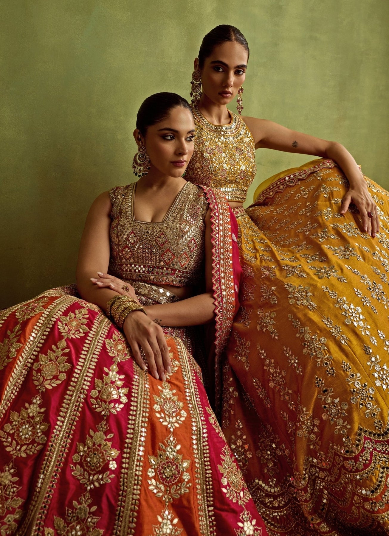 Radiate festive charm in this Orange and Hot Pink Silk Lehenga Set, beautifully adorned with zari and mirrorwork for a luminous finish. The vibrant lehenga and coordinating blouse in coral-orange tones exude effortless elegance, while the sheer organza dupatta adds a soft, glistening touch that enhances the lehenga set.
