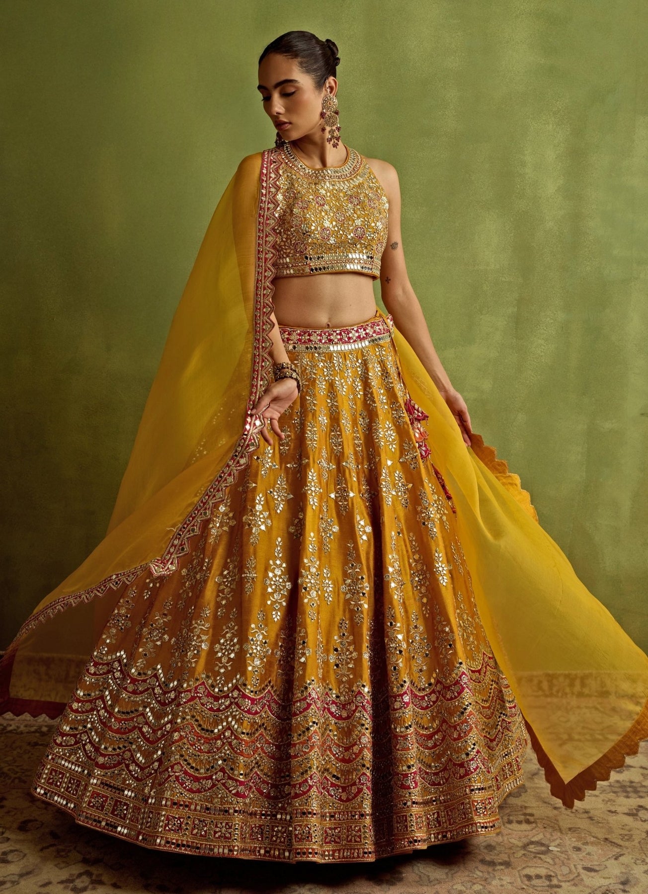 Brighten your Haldi ceremony in this Yellow Silk Lehenga Set with a halter neck blouse. Intricate patchwork, zari, mirror, and gota embroidery adorn the flowing lehenga, while the matching yellow sheer organza dupatta completes the festive look with a whisper of lightness.