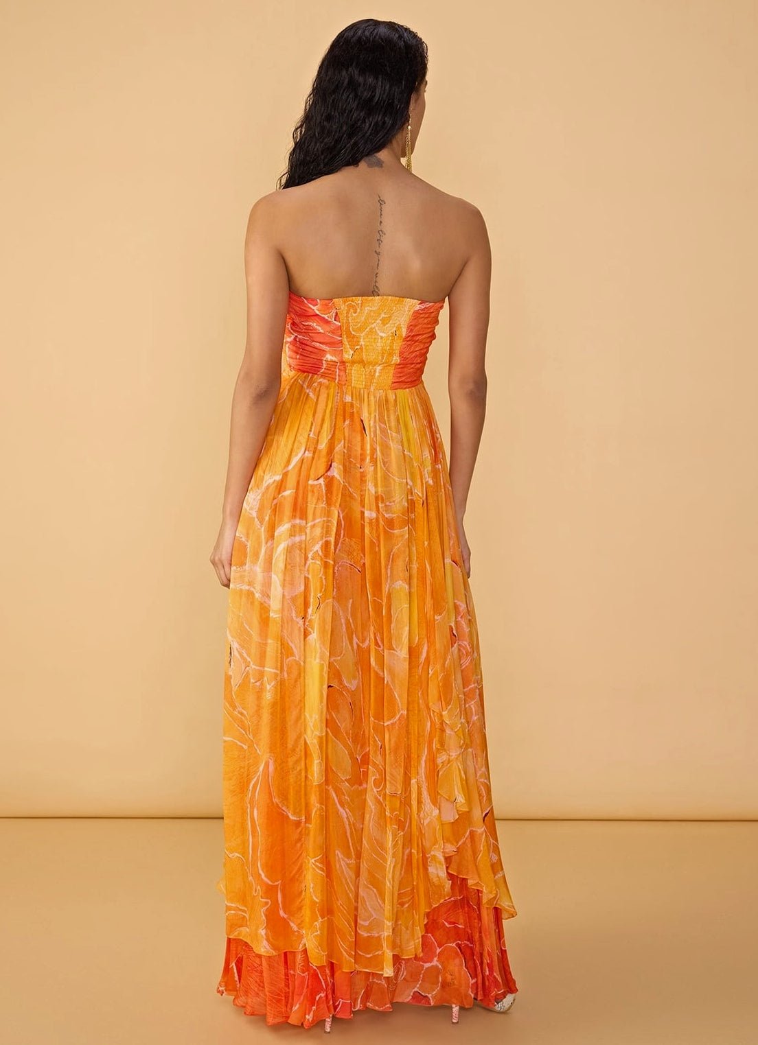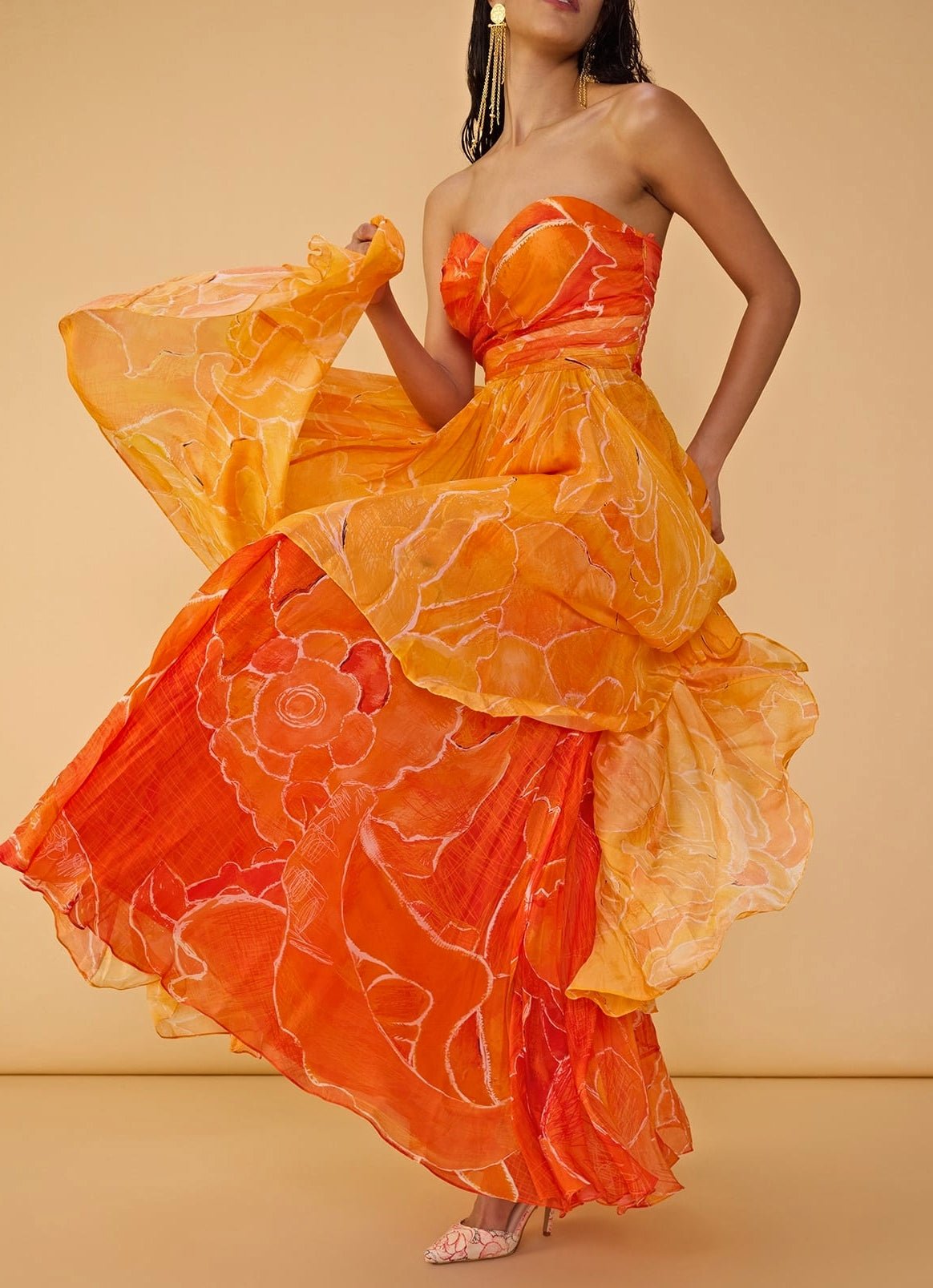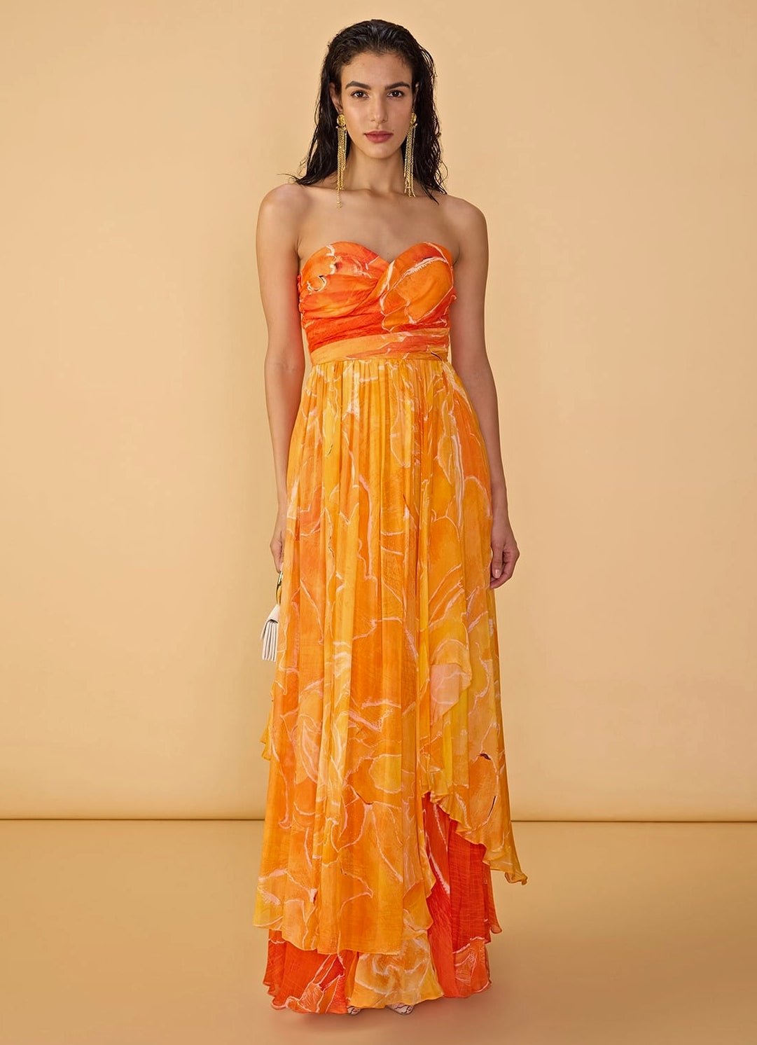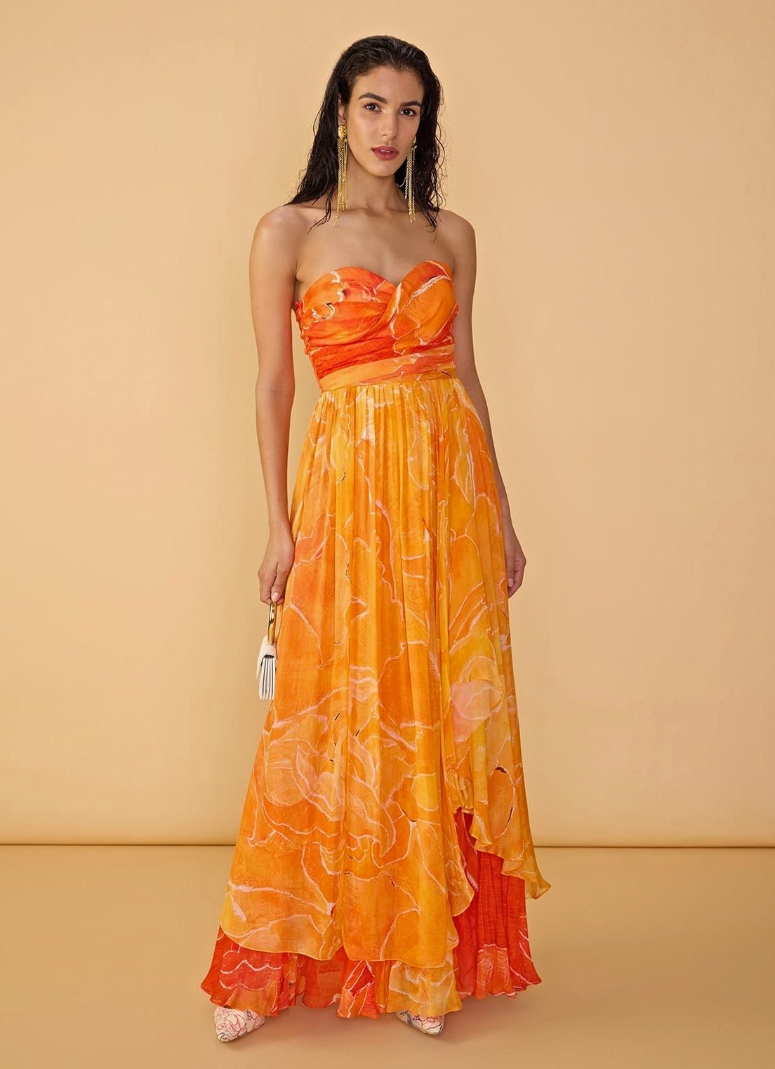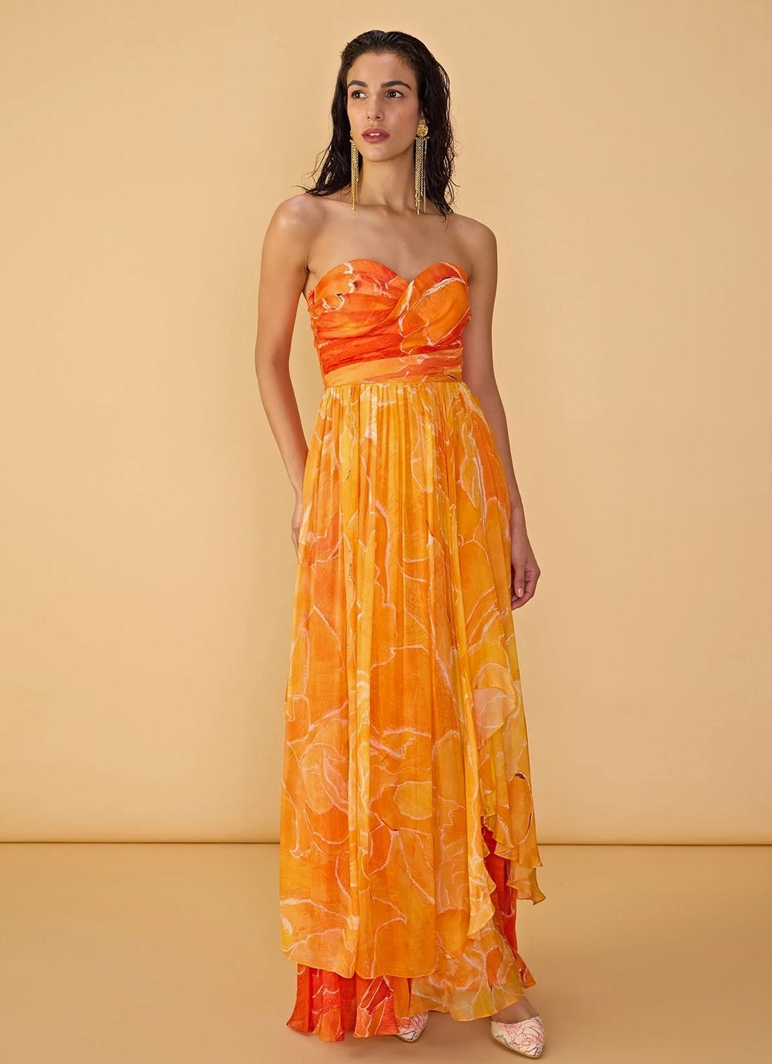 Step into the spotlight with the bold Orange Floral Printed Dress designed for unforgettable moments. This dual floral printed asymmetric strapless dress offers a sweetheart neckline with surplice bodice that adds a touch of personality and glam.
