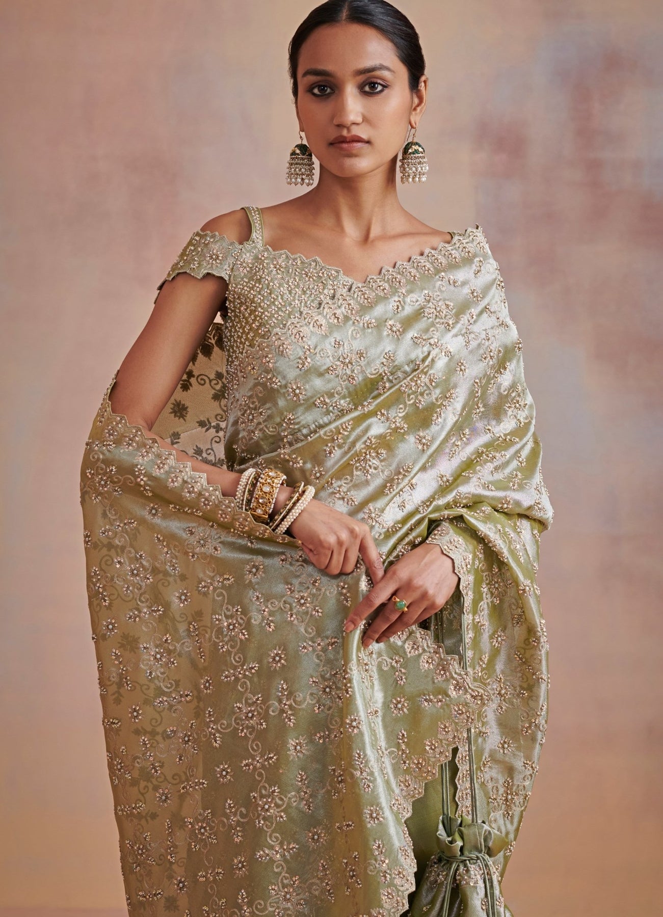 Features a sage tissue saree embroidered with aari work and hand embellished sequence and katdana teamed with a stylish cold shoulder tissue blouse