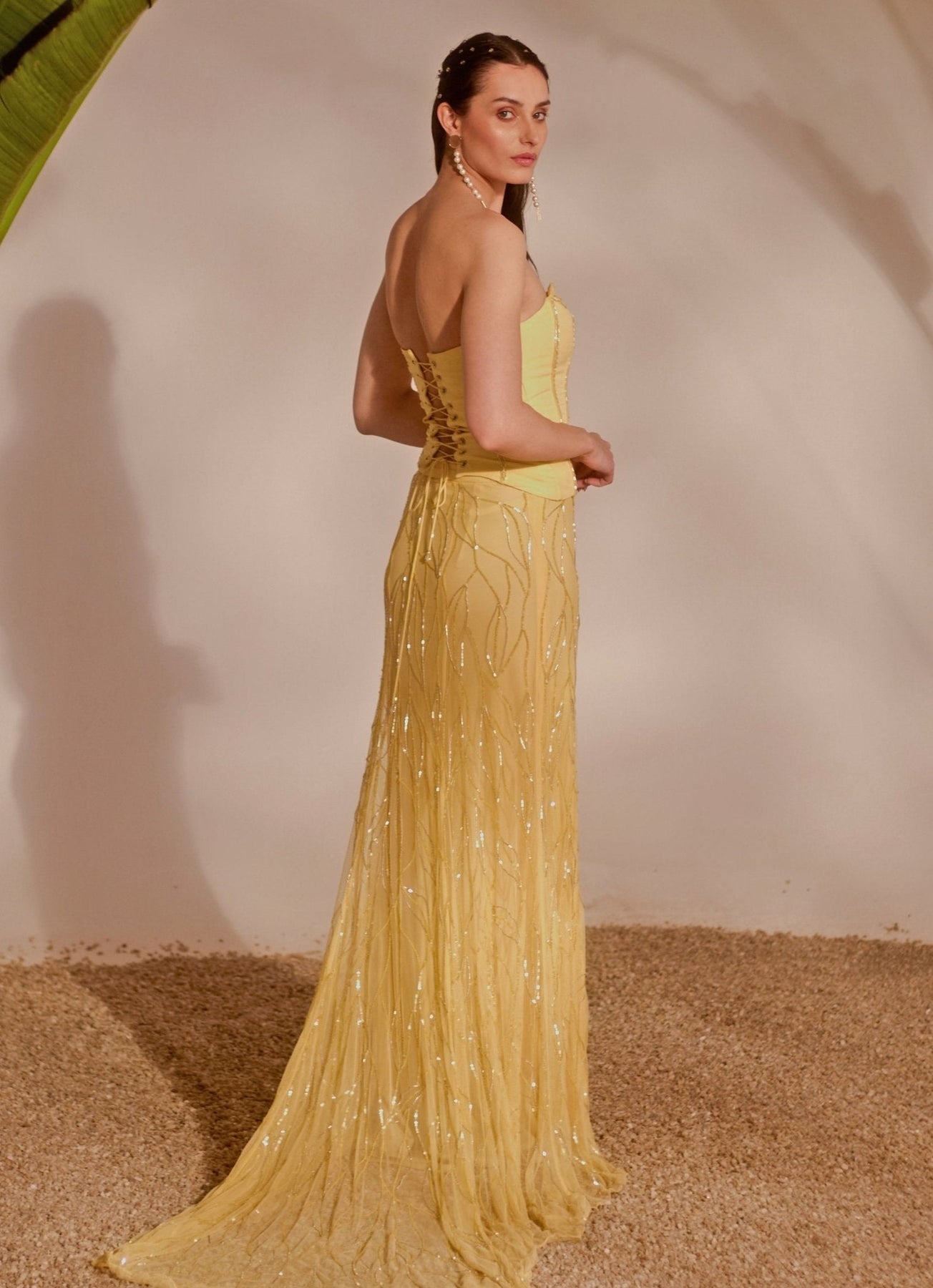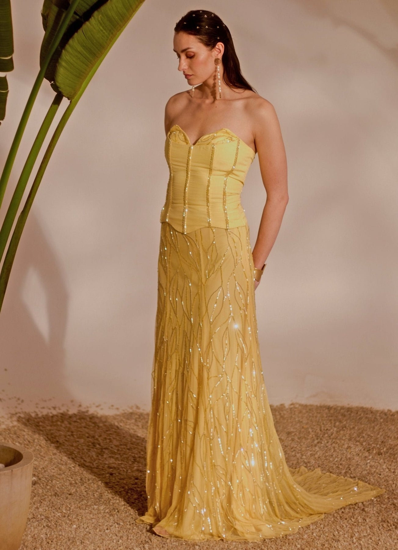 Yellow Embroidered Corset Skirt Set Silky Bindra - Fabilicious Fashion