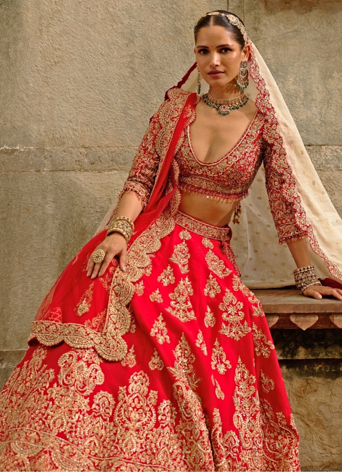 Walk down the aisle with grace wearing this Royal Red Lehenga Set crafted for regal bridal ceremonies. The lehenga is intricately embellished with zari, zardozi, sequins, and crystals, creating a rich and ceremonial finish, while the blouse complements the detailing perfectly. Paired with a dupatta and an optional second dupatta, it delivers enduring elegance.