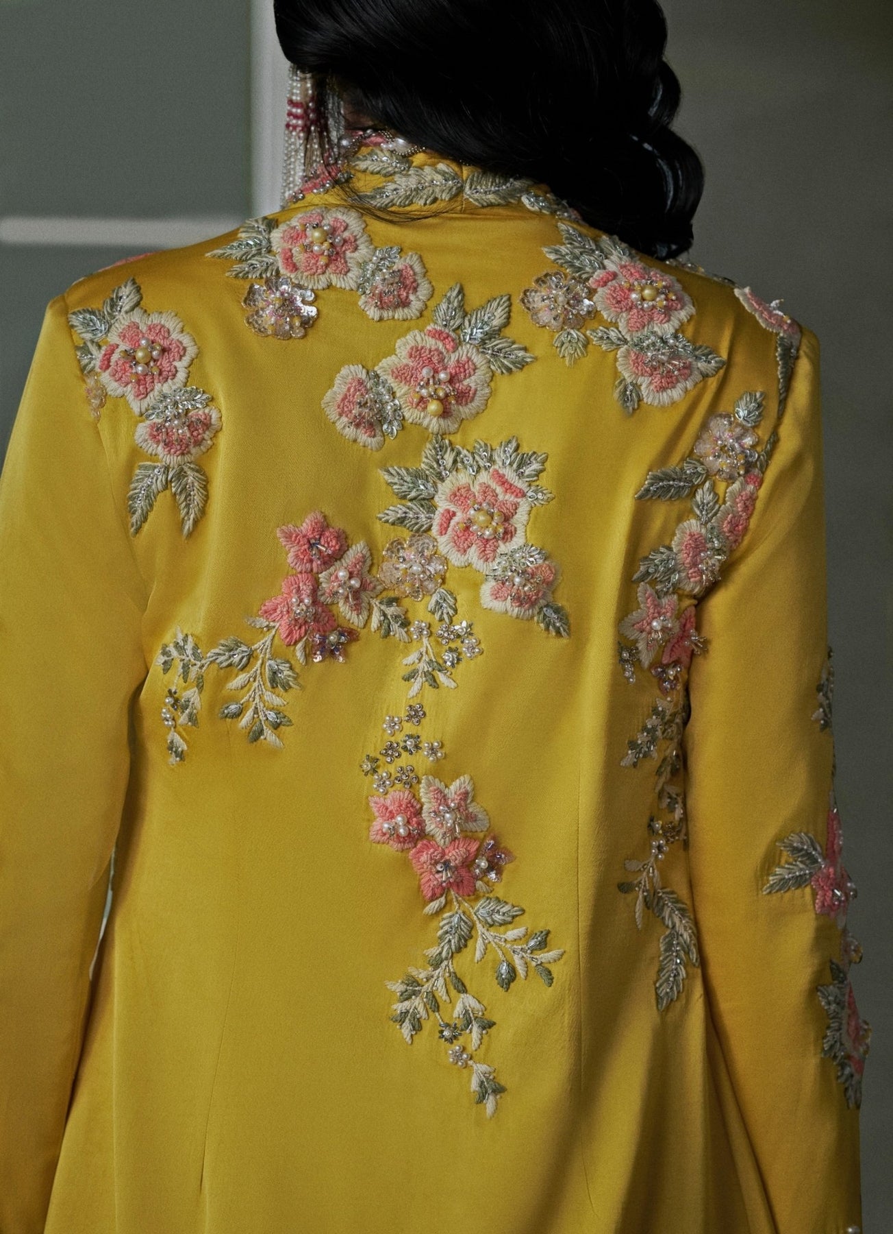 Step into your special moment with timeless elegance in this playful-yet-polished Ivory and Yellow Jacket Trouser Set. Begin with multicolour floral printed trousers and a matching corset, highlighted with glinting sequins for a statement base. Finish with the yellow silk jacket, richly embroidered in resham with sequins, beads, and crystals, adding shine at every turn, from poolside brunches to sunset soirees, effortlessly polished.
