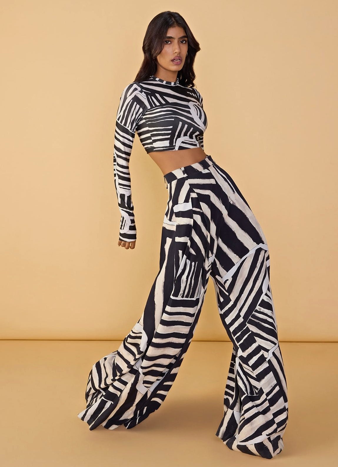 Step into the celebration with the vibrant Black and White Printed Co-Ord Set designed for fun, flair, and festive glamour. The outfit includes an abstract stripe print t-shirt style blouse with long sleeve and boat style neckline. Paired beautifully with matching printed high waist wide leg palazzo pants that adds a contemporary and modern edge to the silhouette.