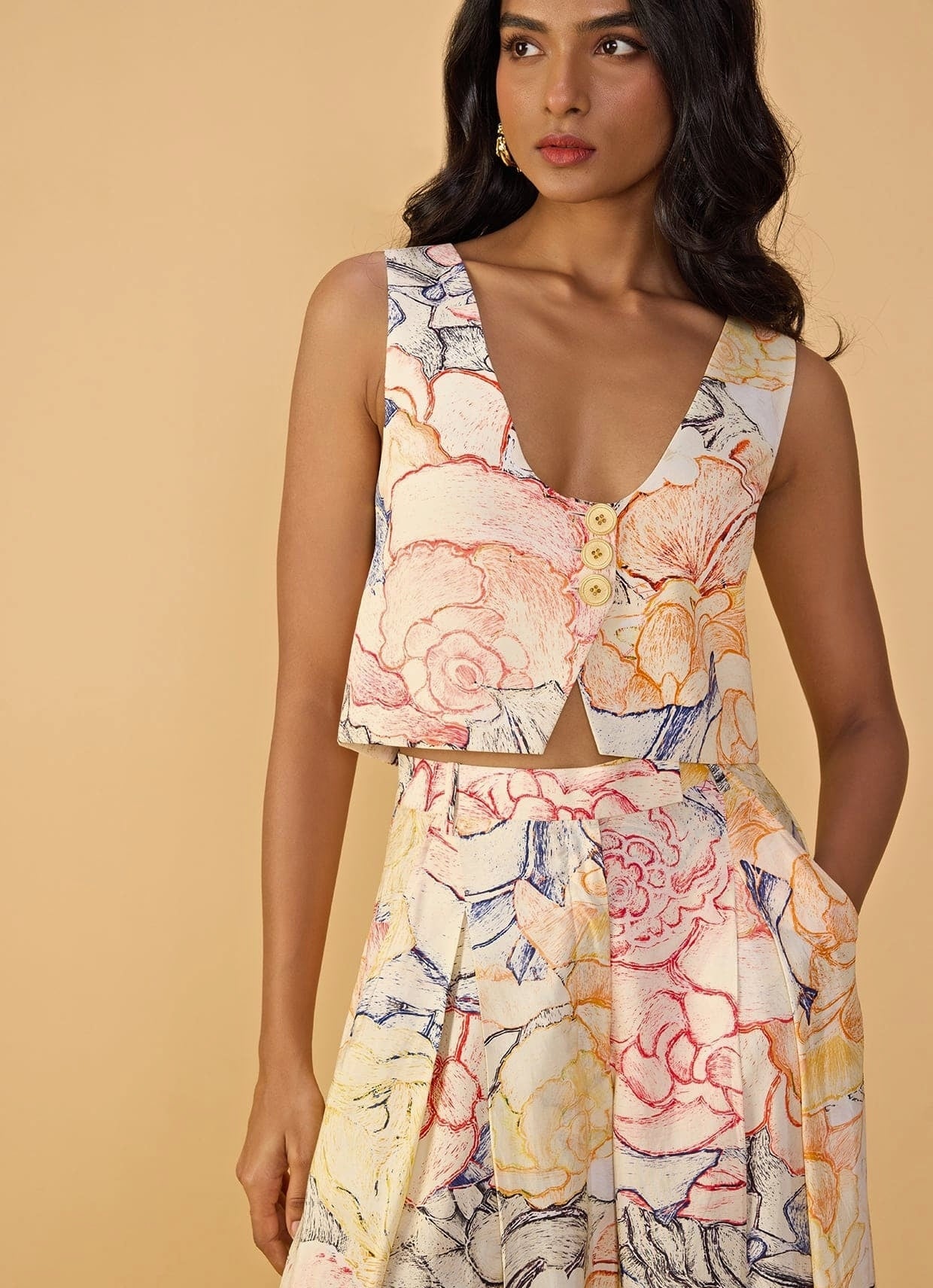 Elevate your guest style with a bold White Multicolour Printed Trouser Set that shines through every celebration. This set features a button down waistcoat with plunge neckline highlighting an abstract floral print, while its beautifully paired with high waist wide leg box pleat trousers with matching prints in 3/4 length with pockets.