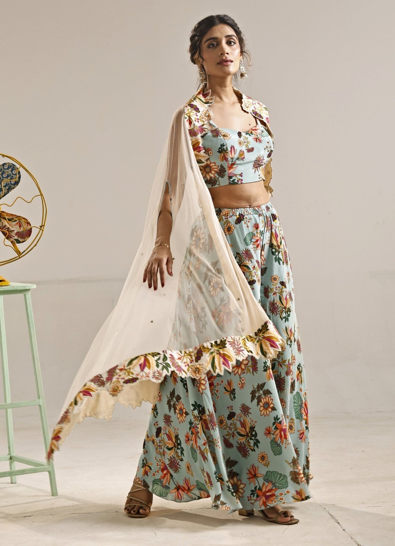Powder Blue Printed Crepe Pants Set With Cape Soup by Sougat Paul - Fabilicious Fashion