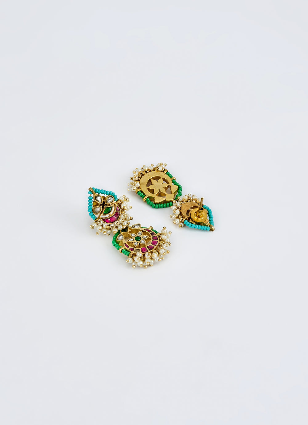 This stunning Gold Plated Turquoise Beaded Necklace Set features exquisite turquoise beaded strands complemented by vibrant enamel work and intricate detailing. With its bold design and detailed craftsmanship, this statement piece is completed with matching earrings. Perfect with a saree, lehenga or indo western attire. The necklace, measuring 18-20 inches in length and 4-5 inches in width, showcases unmatched artistry through its mix metal craftsmanship, while the matching earrings, 2-3 inches long and 1-1.5 inches wide, complete the traditional look.