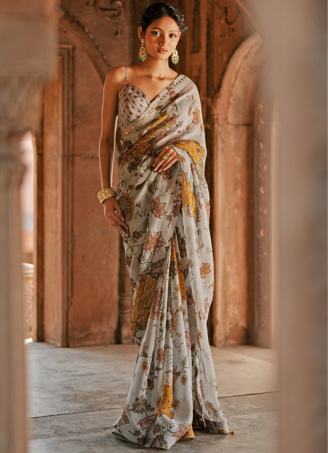Yellow Floral Printed And Pre-Draped Chiffon Saree