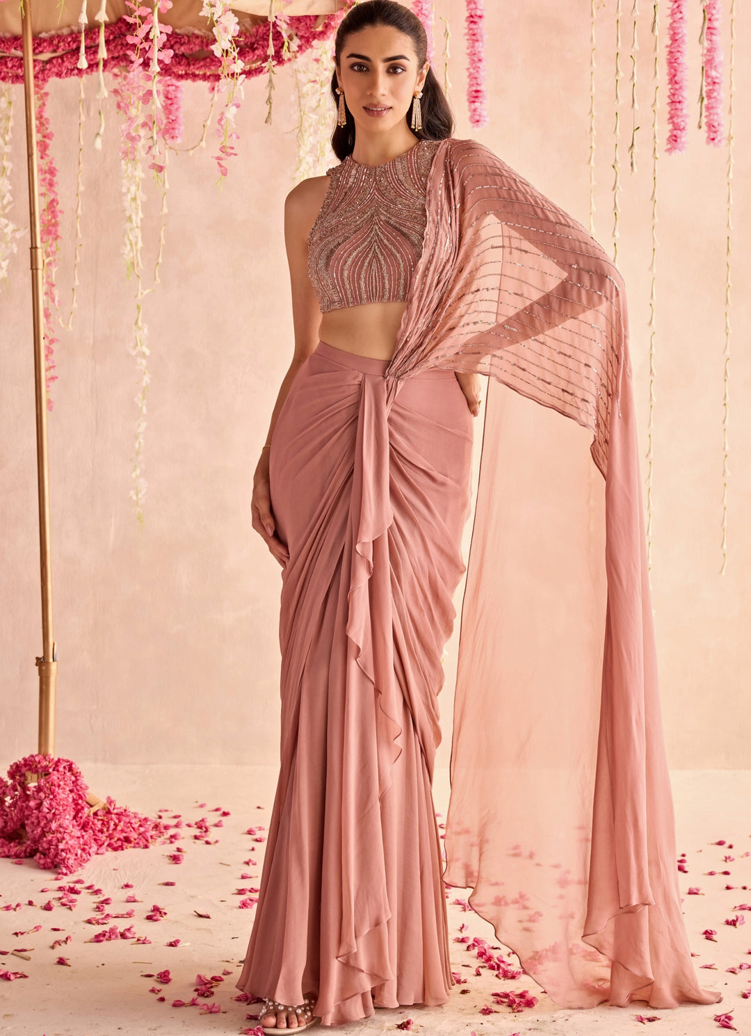 Brown Predraped Georgette Saree Set With Halter Blouse