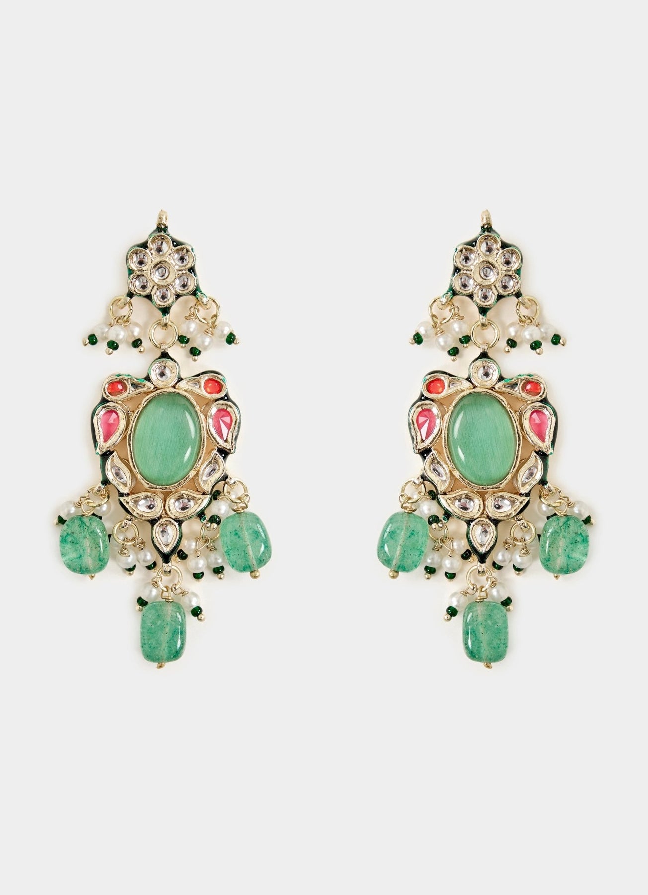 An exquisite gold-tone choker necklace set adorned with green beads and intricate detailing, paired with matching earrings. A striking statement piece designed for weddings, festive occasions, and cultural celebrations.