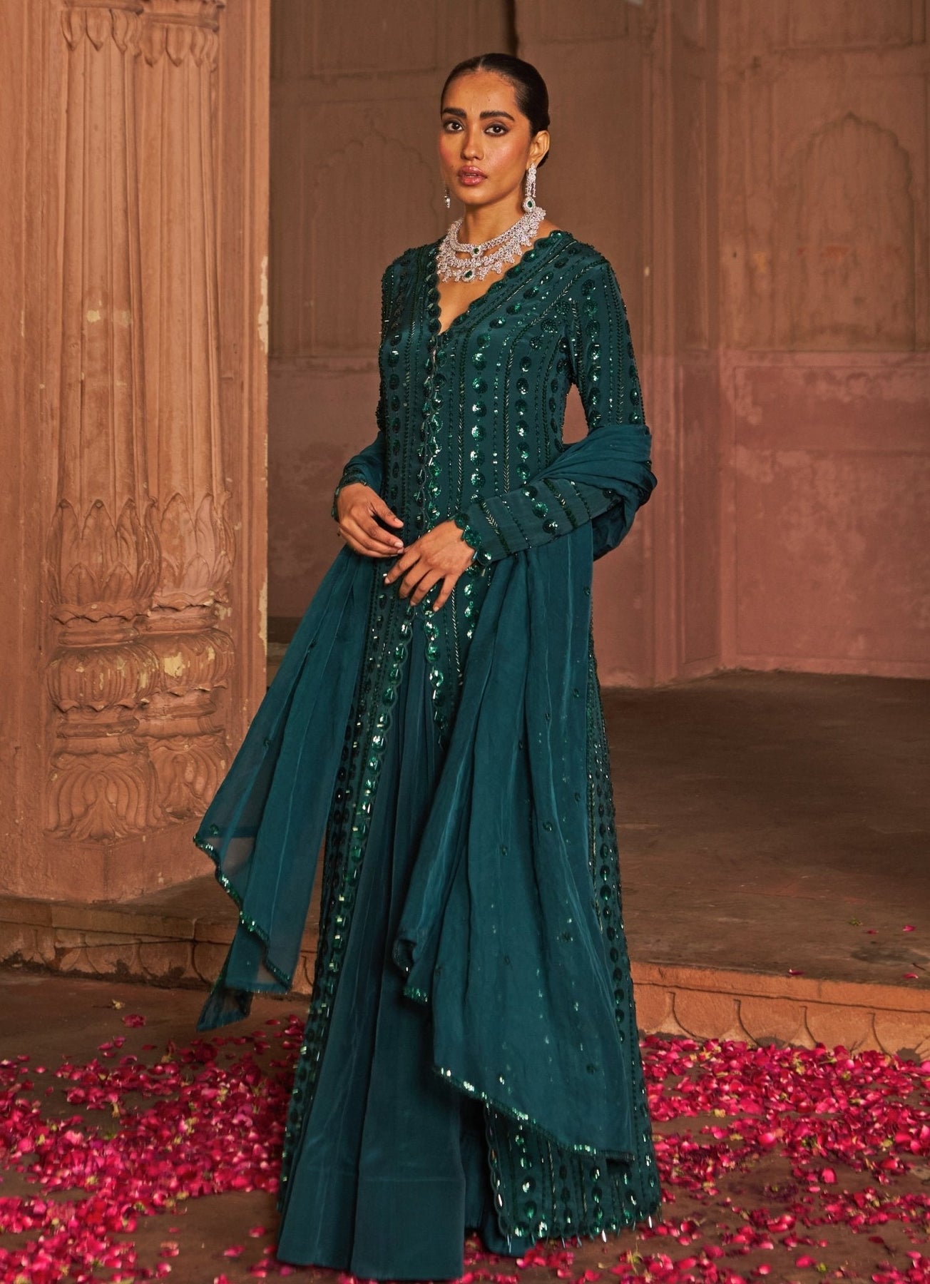 This breathtaking Bottle Green Sequin Embroidered Kurta Lehenga Set is the epitome of elegance and sophistication. Crafted from luxurious crepe fabric, the bottle green kurta is adorned with intricate geometric embroidery and delicate floral sequin accents, adding a refined touch to its full-sleeve embellished design. Paired with a flowing crepe lehenga, this outfit exudes graceful charm and timeless appeal. The look is completed with a delicately embroidered organza dupatta, enhancing the attire with a sheer, ethereal finish.