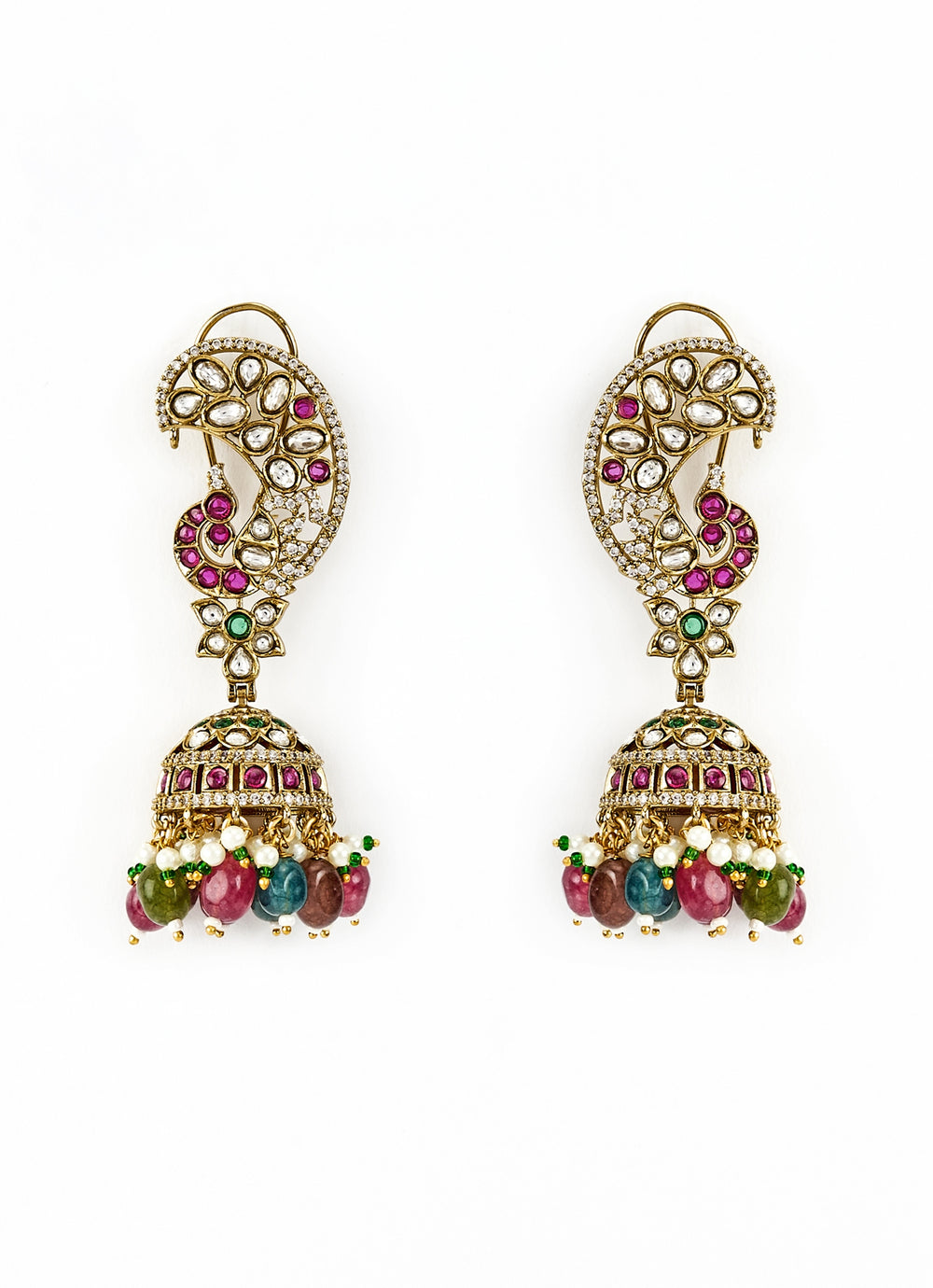 Introducing Gold Plated Multi Kundan and Polki Jhumkas Earrings - a stunning piece that combines elegance and tradition. Adorn yourself with these intricately designed earrings, featuring a mesmerizing peacock-inspired motif embellished with vibrant stones and delicate beads. Designed to add a regal charm to your lehenga, these jhumkas are perfect for Sangeet, Weddings, festive occasions and celebrations.