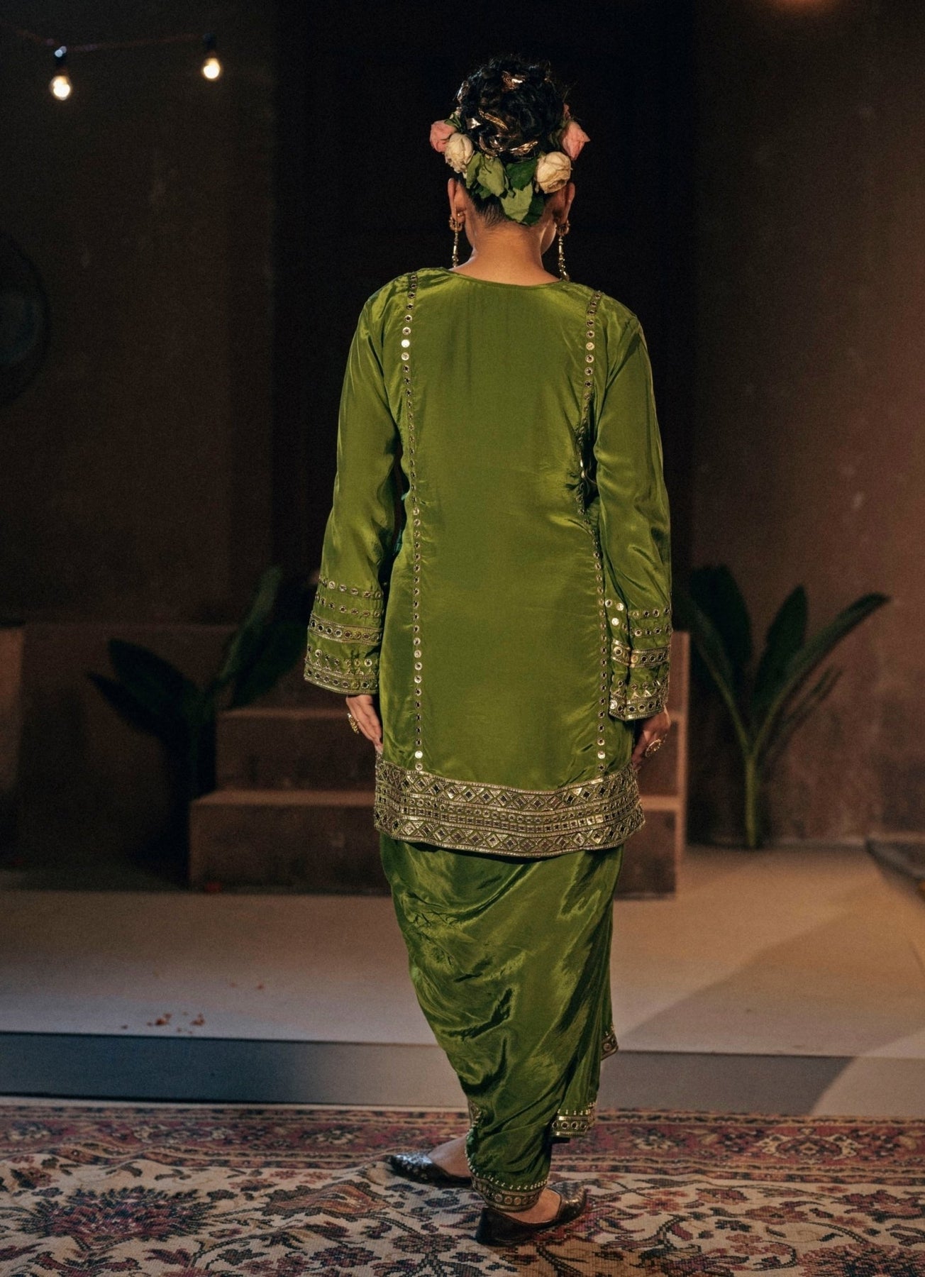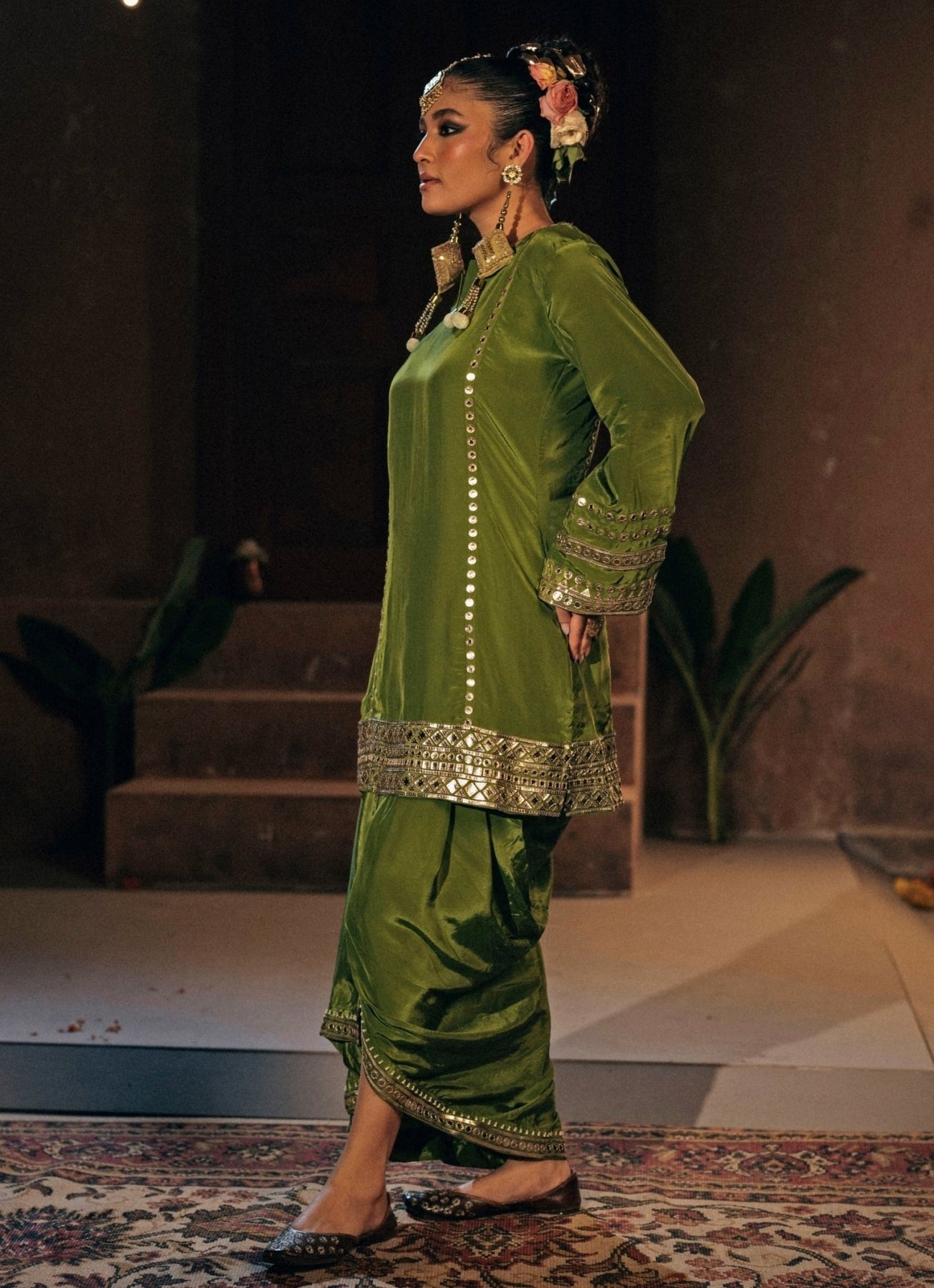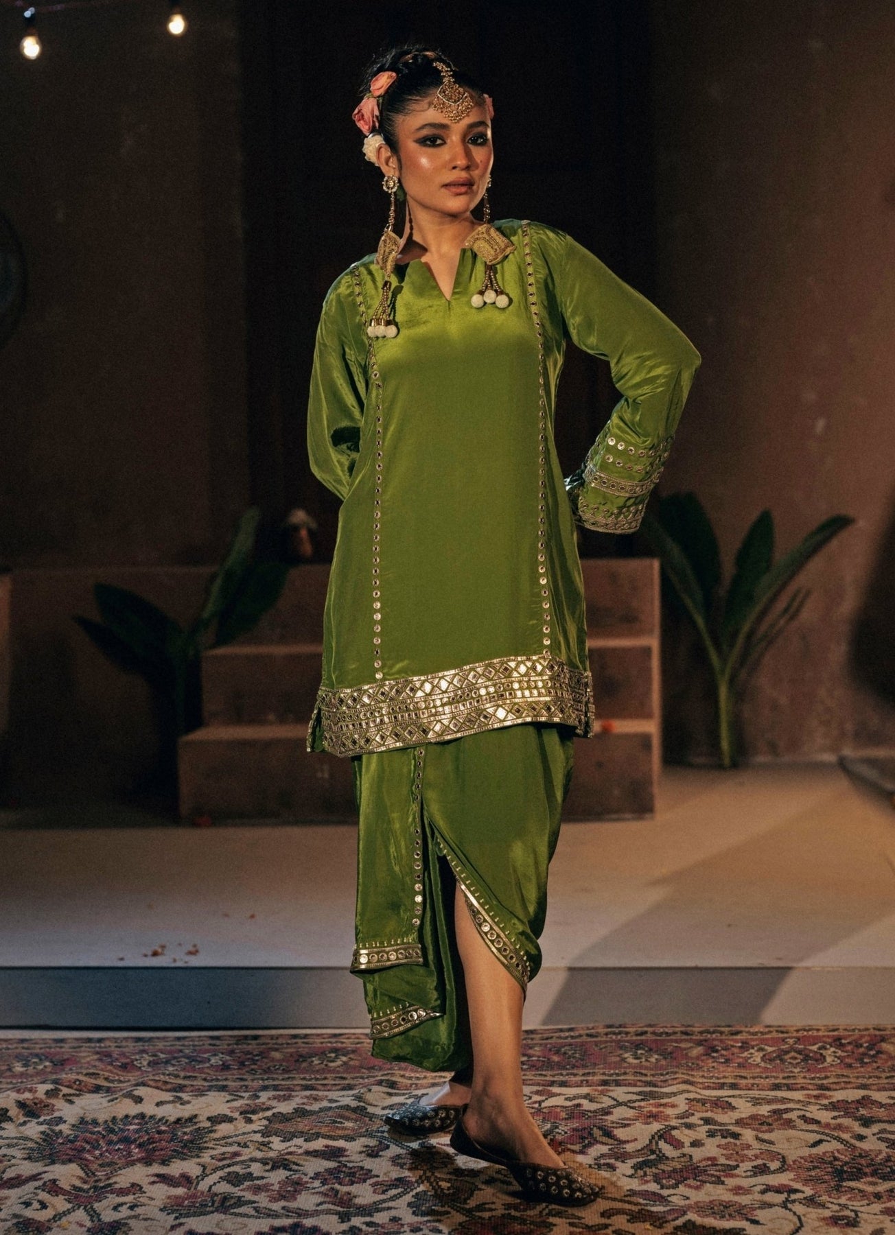 Radiate joy and sophistication for your loved one's big day in this Mehendi Green Kurta with Drape Skirt Set. The pleated skirt flows beautifully with every step, adding contemporary flair to celebratory moments. It is paired with a structured kurta tailored in crepe silk blend, offering a relaxed yet polished fit that feels modern and refined.