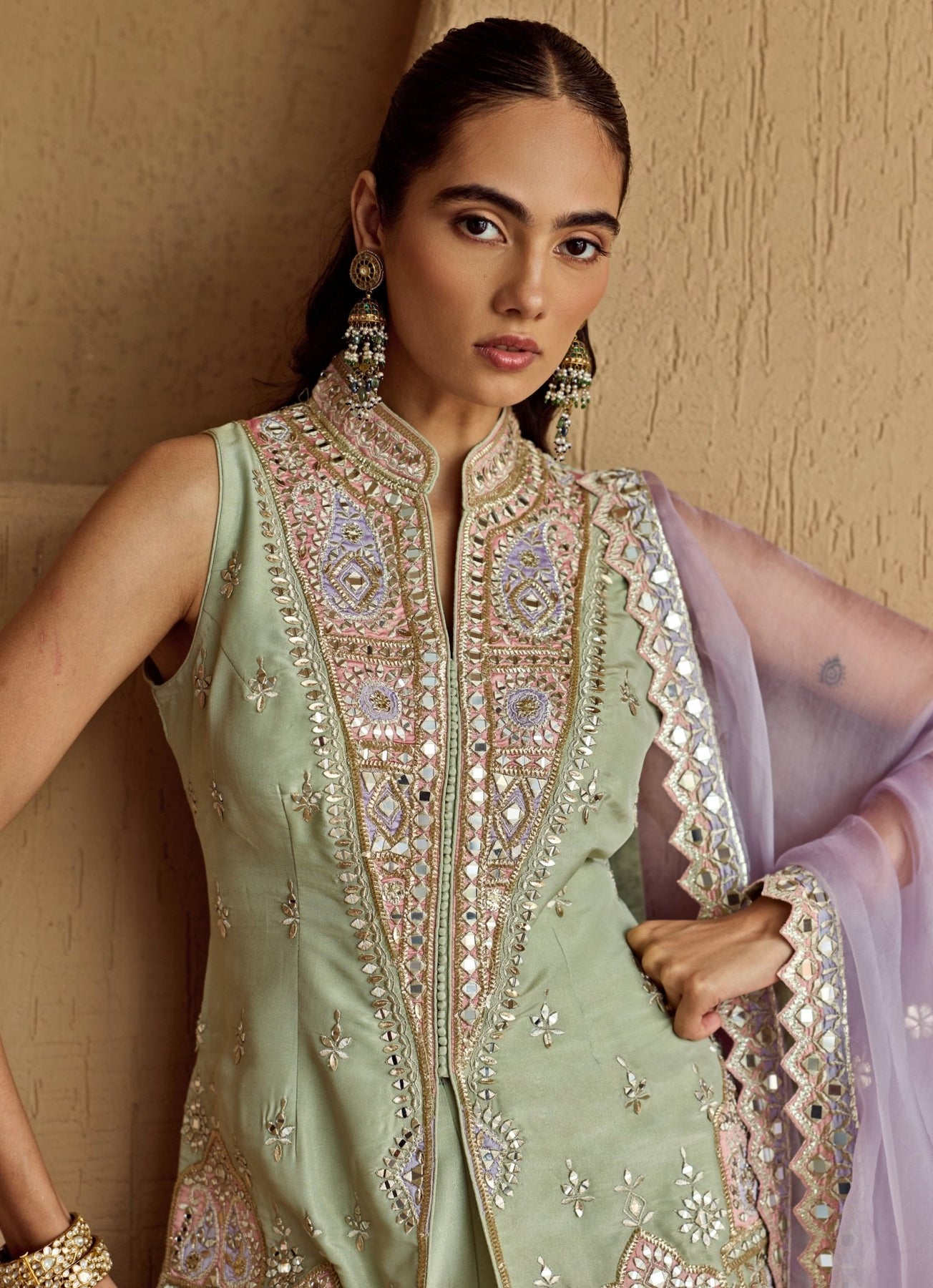 Elevate your Mehendi and Sangeet celebrations in Mint Green brilliance. The tissue kurta features pink and purple patchwork with shimmering zari and mirrorwork, flowing seamlessly over voluminous garara pants. The organza dupatta adds a light, airy finish, creating a festive, luminous garara look.