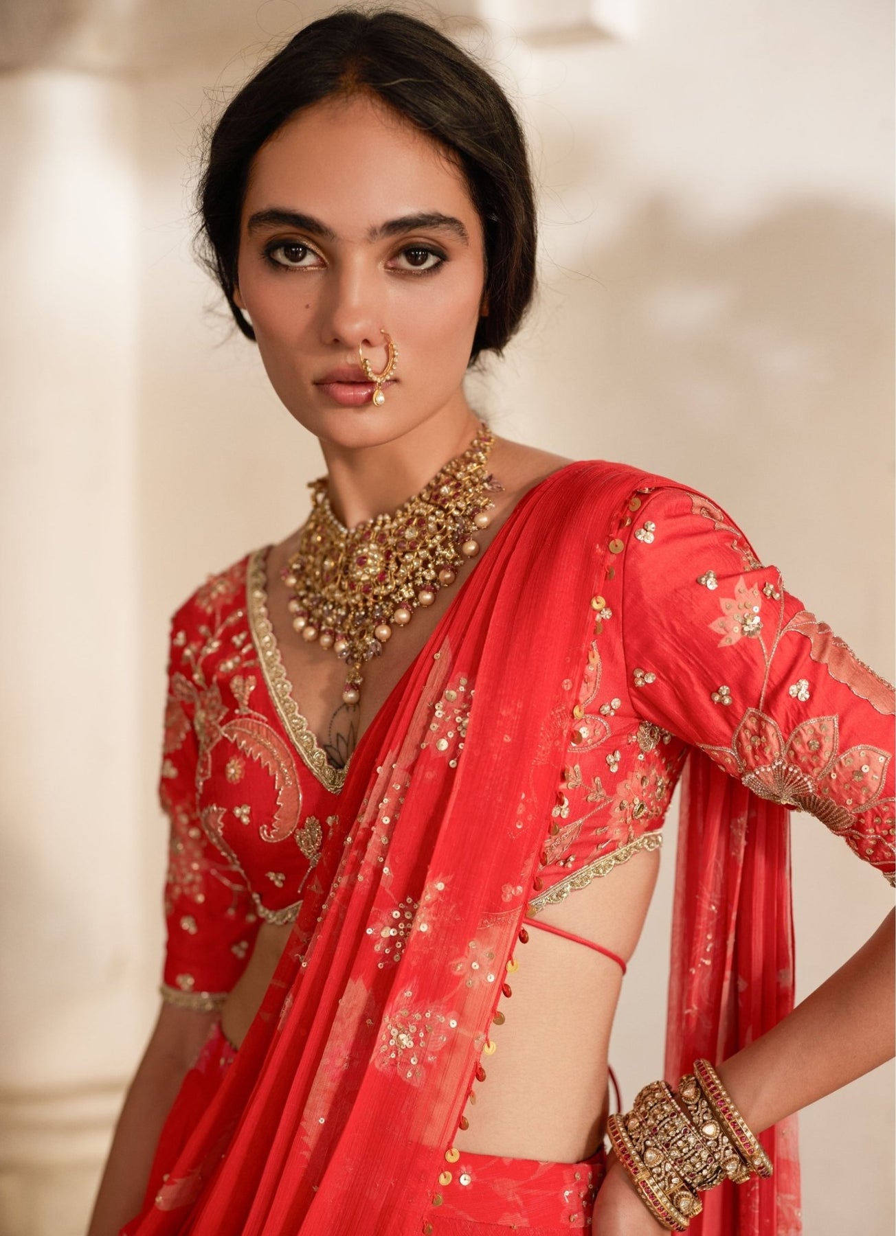 Step into family celebrations with this Red Pre-draped Saree that feels festive yet effortless. The ready to wear saree is designed for easy wear, finished with a subtly sequin-highlighted pallu that catches the light beautifully. A signature floral-printed blouse brings the main moment, fully hand-embroidered with detailed borders and hand-tucked tassels for artisanal charm. Pair with a tiered choker and a statement bangle for polished elegance.