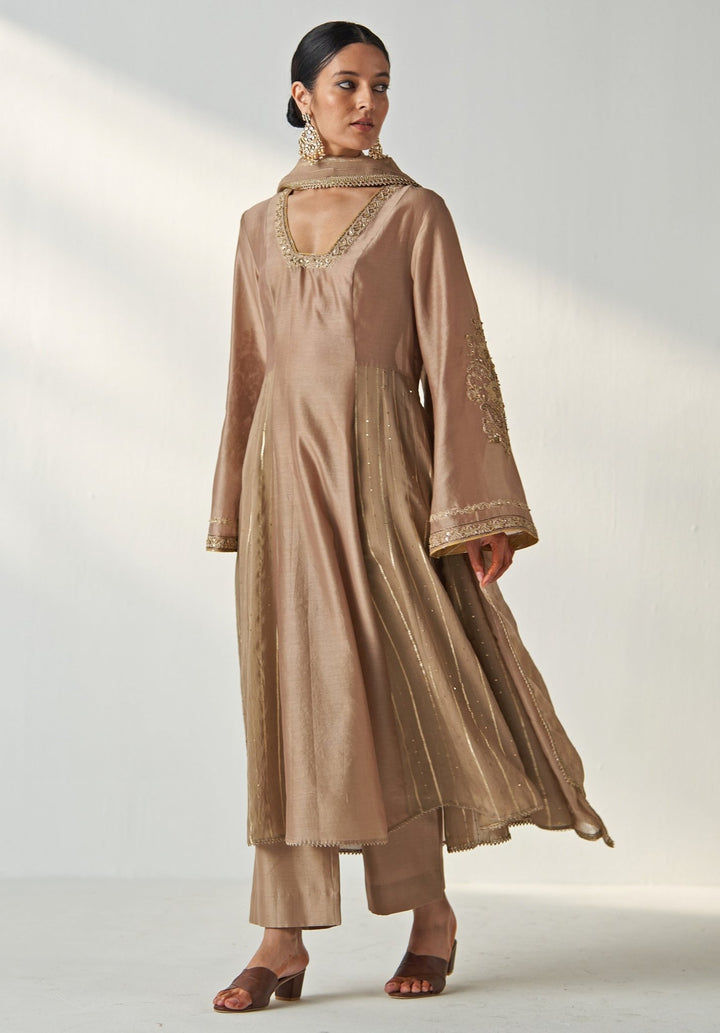 Nude Gold Embroidered Chanderi Anarkali Pant Set Studio Bagechaa - Fabilicious Fashion