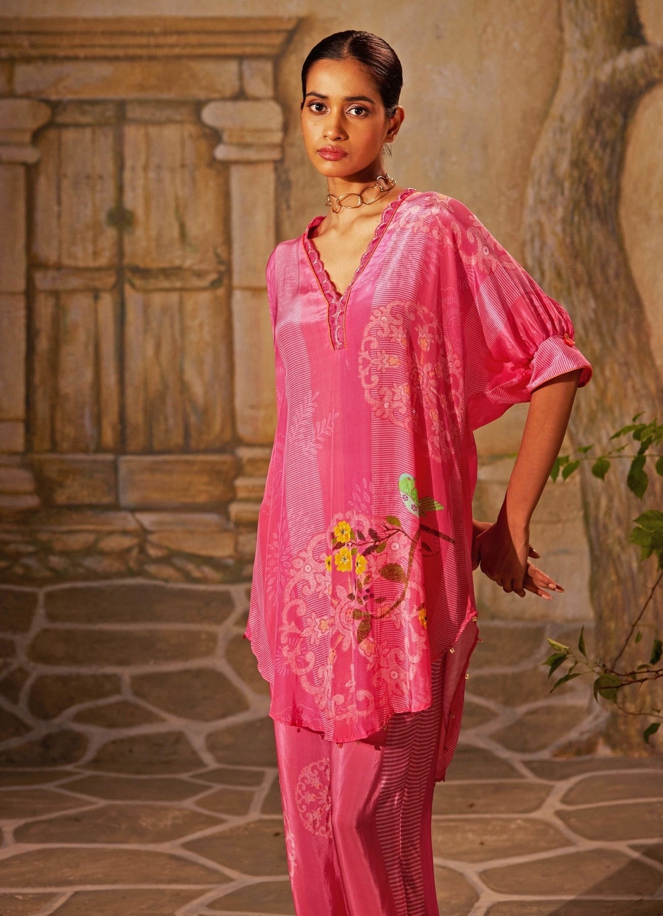 Make a statement in this stunning Pink Printed Crepe Co-ord Set, designed for effortless elegance and comfort. Crafted from lightweight crepe fabric, the flowy pink tunic showcases intricate prints, a beautifully embroidered organza neckline, and rolled-up sleeves for a touch of casual sophistication. The relaxed fit ensures all-day comfort, while the matching crepe pants complete the look with effortless grace. Perfect for Home Poojas, festive gatherings, or stylish brunches, this indo western co ord set pairs beautifully with minimal accessories for an effortlessly chic appeal.