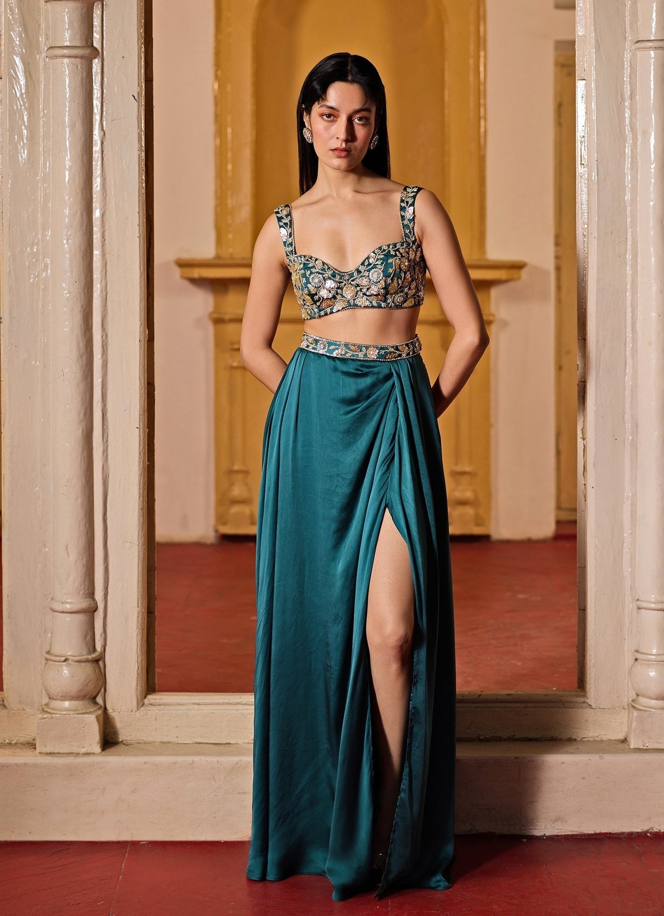 Step into elegance with this stunning Teal Green Embroidered Slit Skirt Set with Jacket, designed for those who appreciate timeless craftsmanship with a modern touch. Crafted from luxurious satin fabric, the draped teal green skirt flows gracefully, featuring a flattering front slit and delicate embroidery on the waist. Teamed with an intricately hand-embroidered blouse showcases exquisite floral detailing, adding a touch of opulence. Completed with a sheer organza jacket, adorned with hand embellishments that create a subtle shimmer.