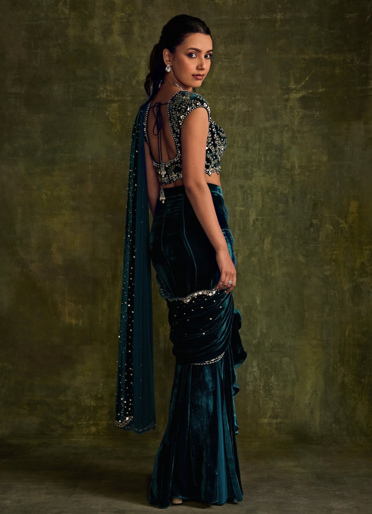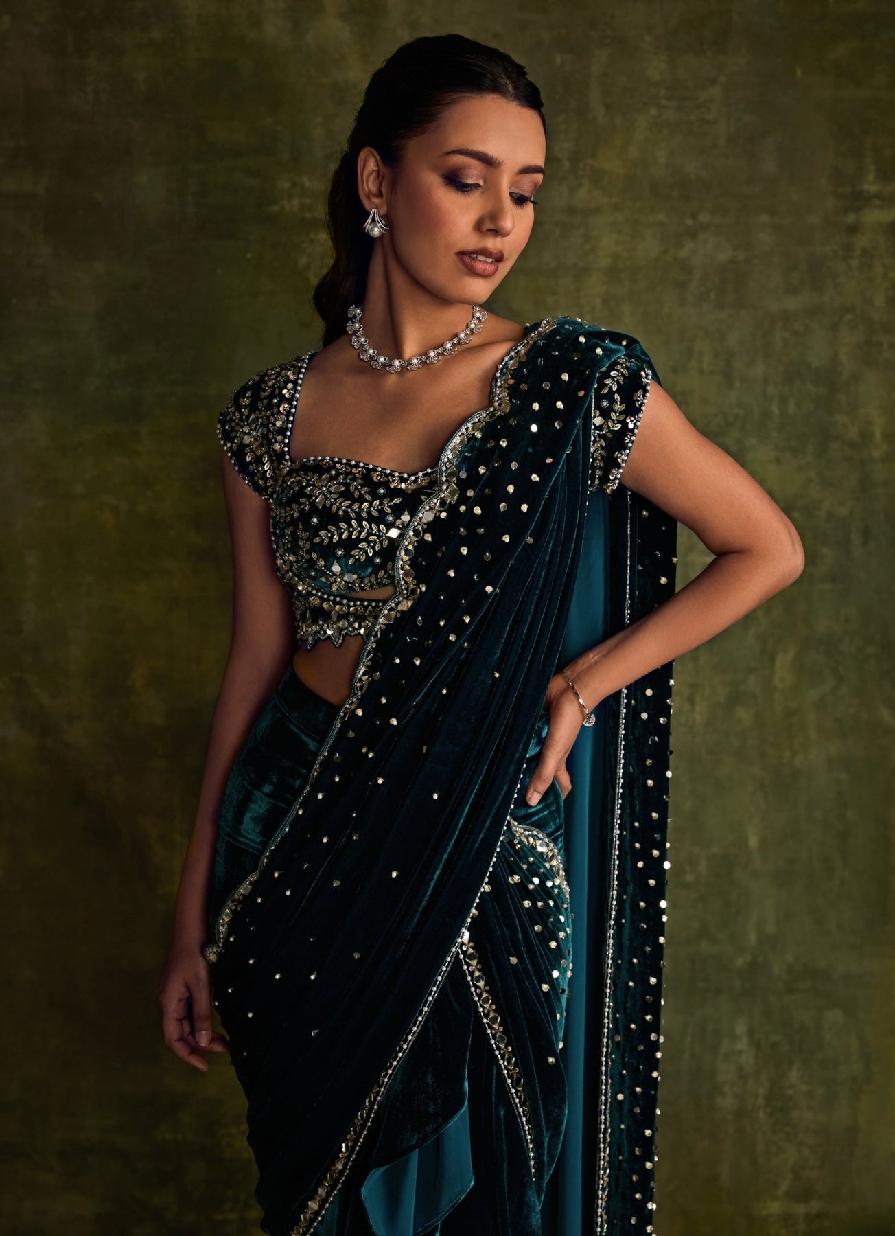 Radiate joy and sophistication for her big day in this Teal Blue Velvet Pre-draped Saree. The luxurious silk velvet features scalloped mirror borders that shimmer with each movement, while the pre-draped pallu ensures effortless elegance. Paired with a signature cut-out blouse, this look blends modern ease with timeless opulence.