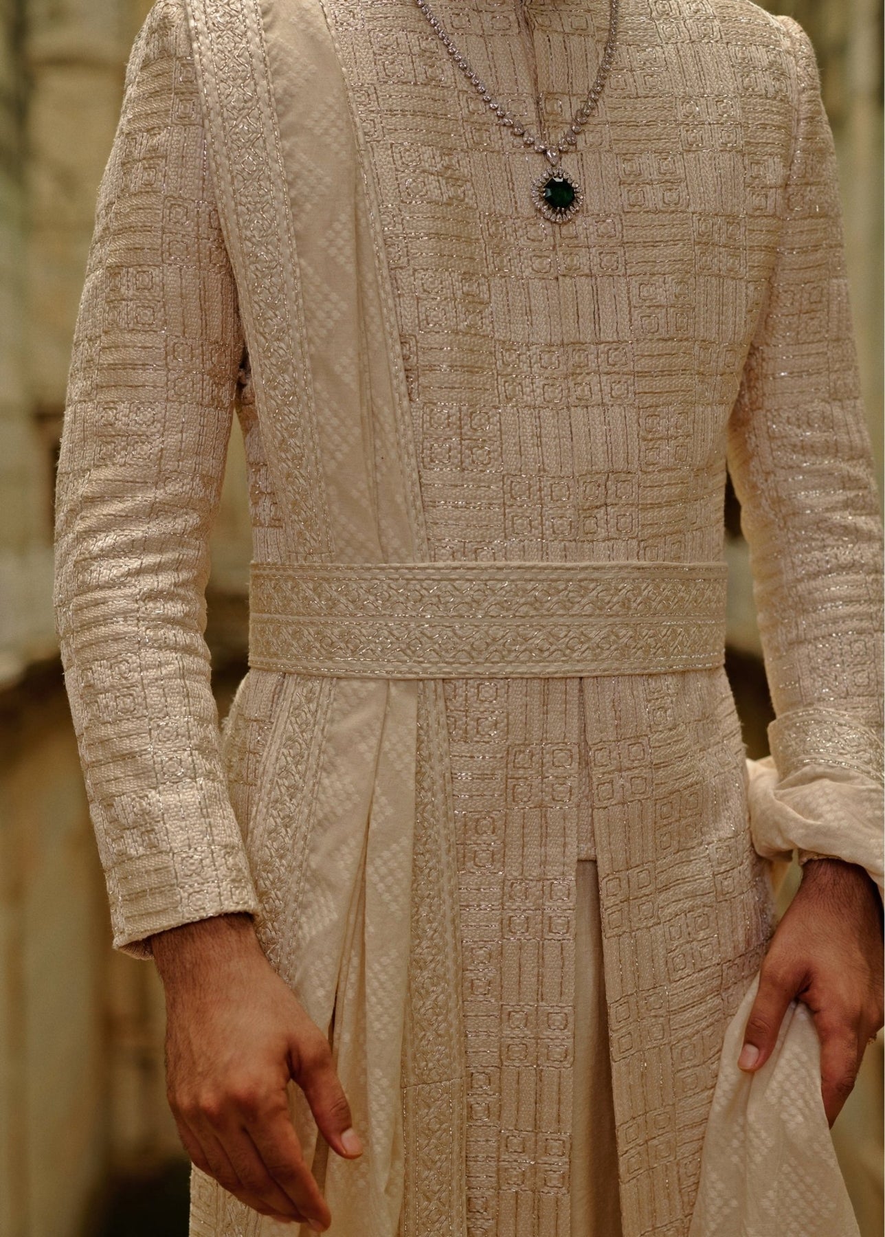 Bring a fearless festive edge to intimate functions in Light Beige Sherwani Set. This raw silk sherwani is embroidered with self resham in a geometric pattern and highlighted with rose gold dabka pitta work for distinctive richness. Optional belt, stole and jutis allow custom styling for grand occasions.