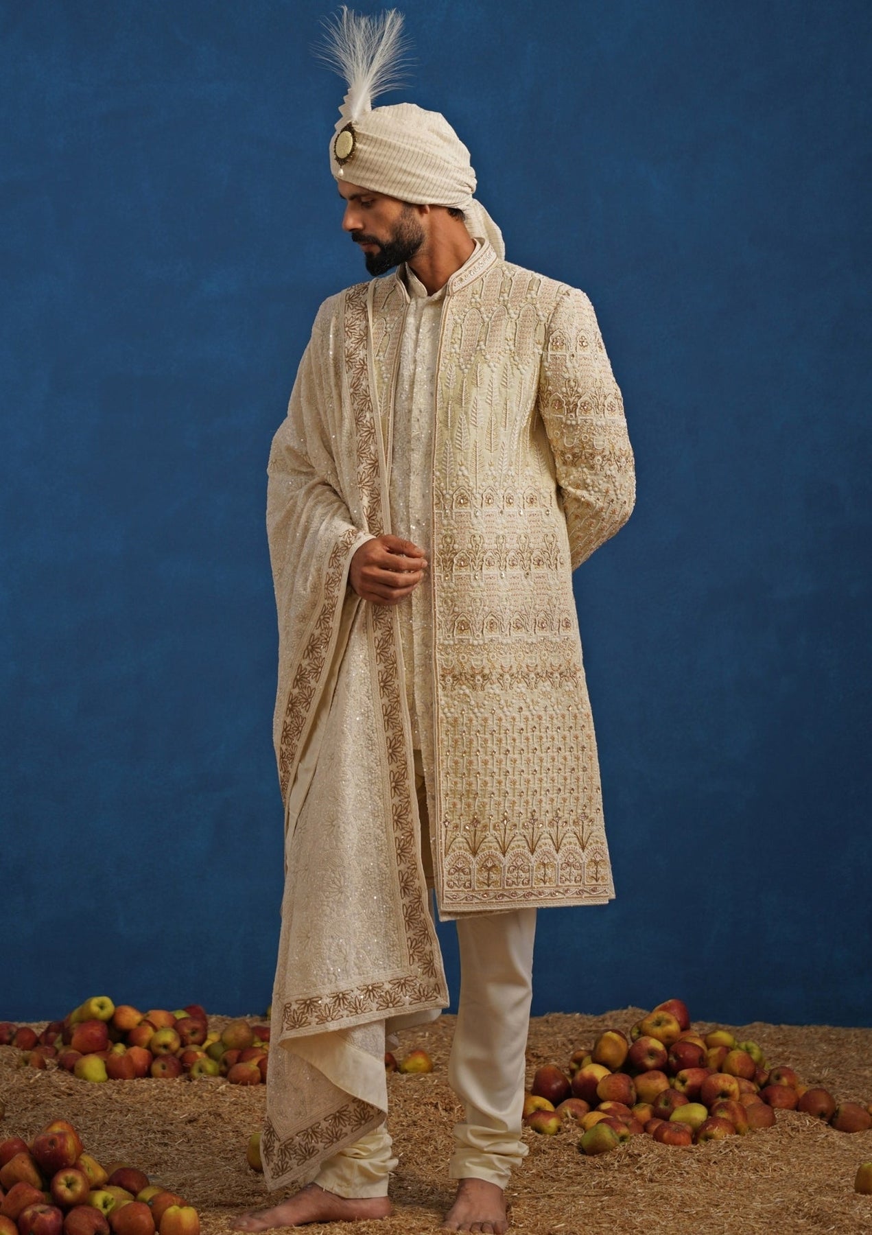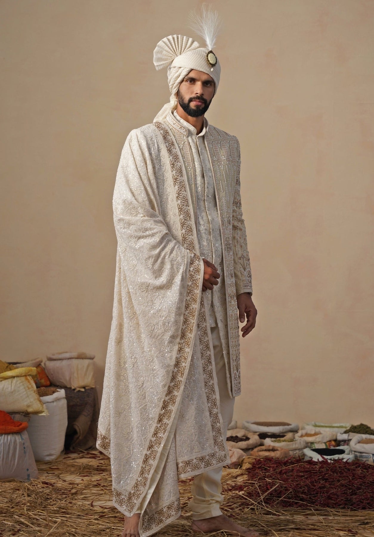 Own the spotlight on the big day with this Cream Sherwani Set, rooted in classic ceremony. The churidar builds a traditional base, followed by the coordinated inner kurta kept subtle for balance. The long georgette sherwani is finished with rich zardozi embroidery in floral and ornamental motifs, framed by a clean neckline and structured finish. Add the matching dupatta and complementary turban for a truly groom-ready look.